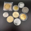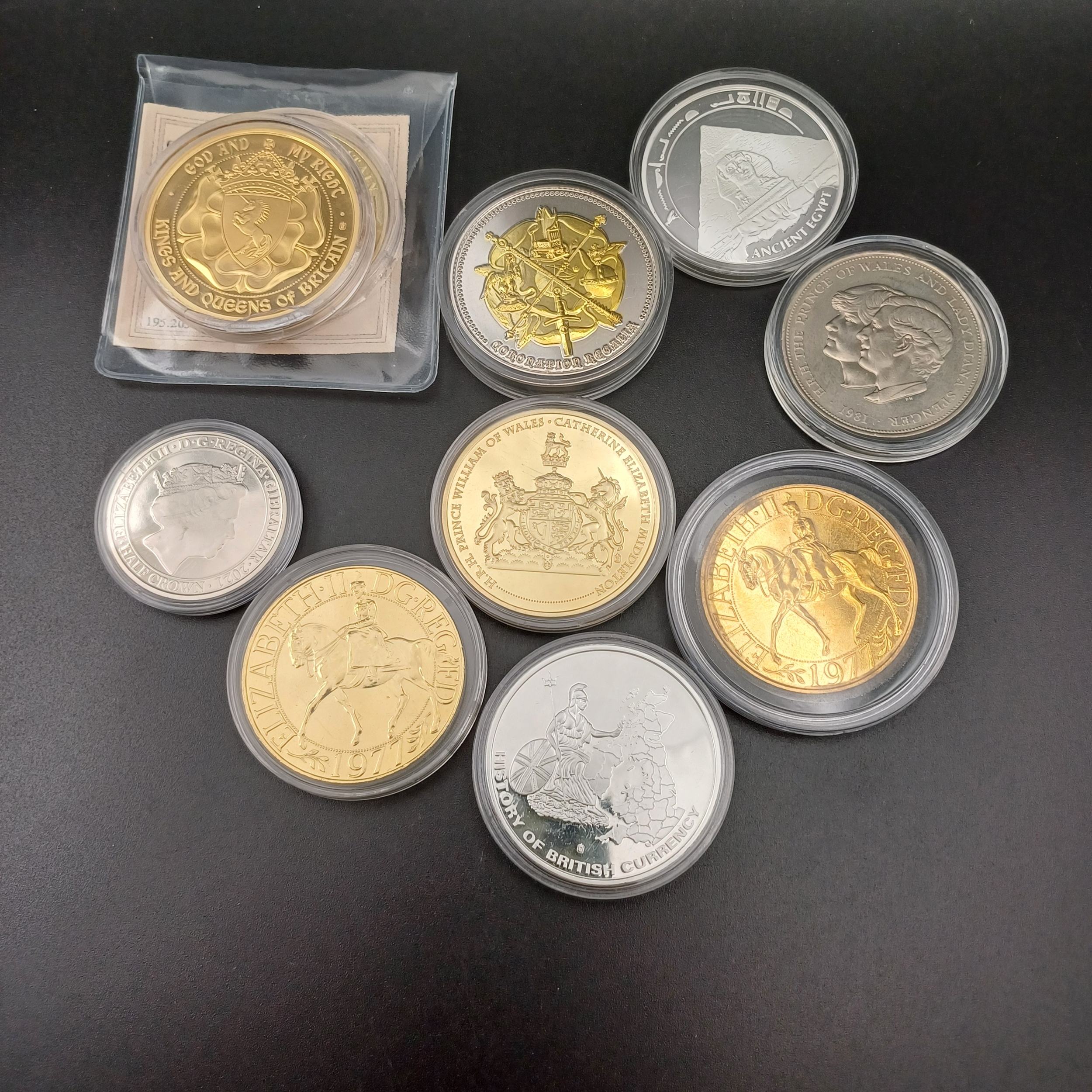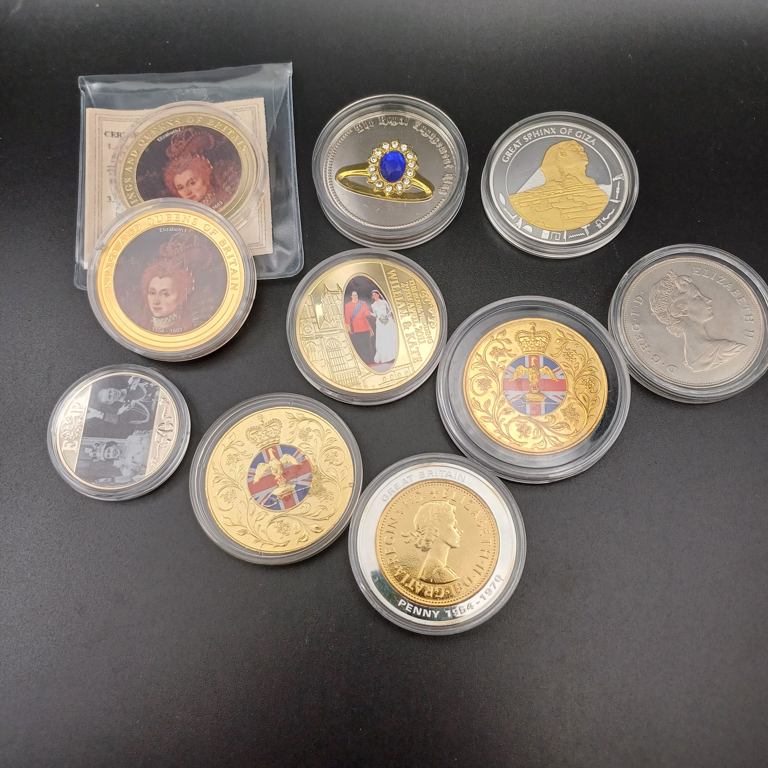 Collection of 10 various medals/coins in silver/gold plate one with stunning crystal as replica of the royal engagement ring,