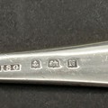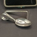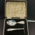 Boxed Silver Baby Pusher and Spoon. Birmingham Assay for I. S. Greenberg & Co date stamp 1937. Total silver weight 40g