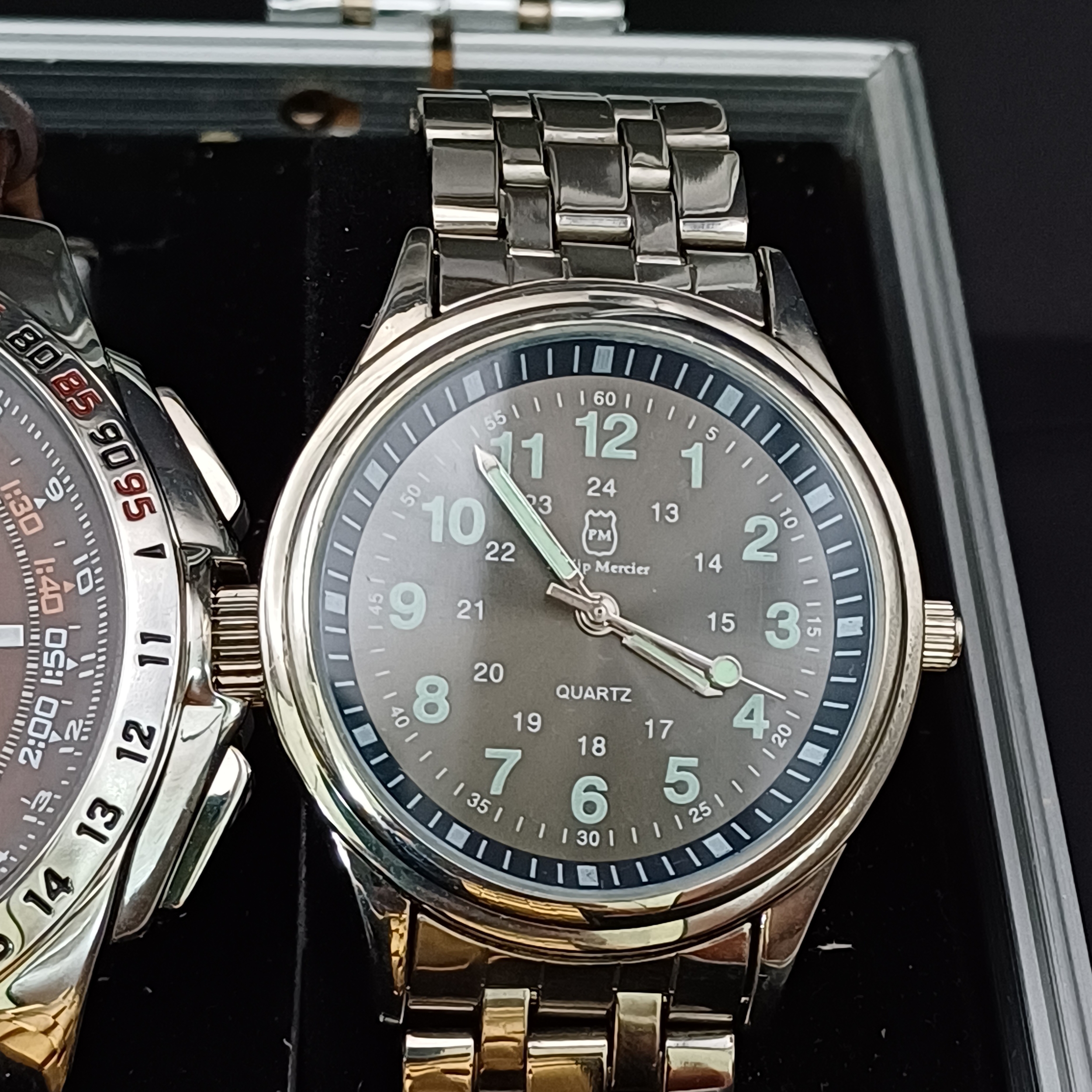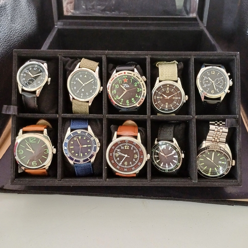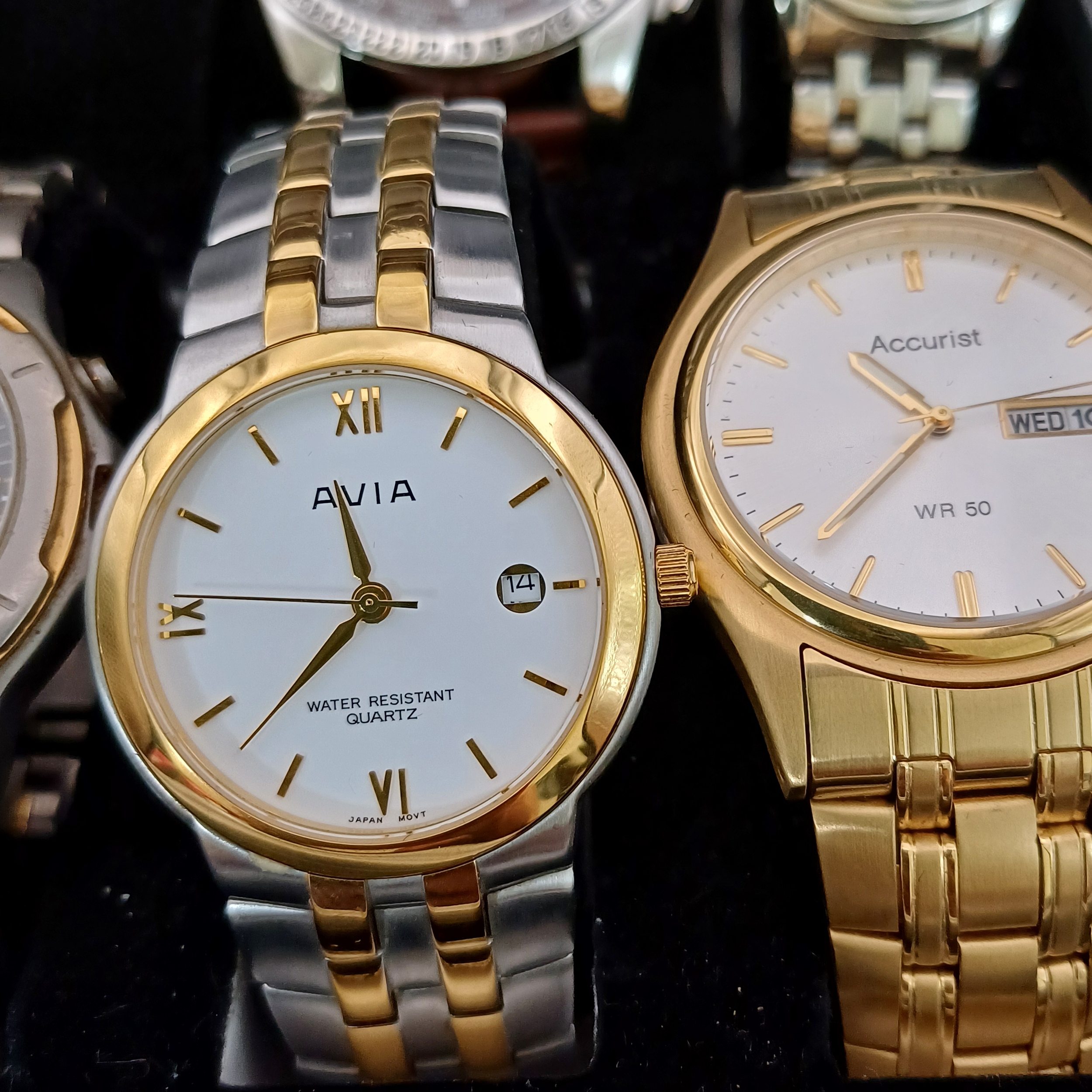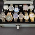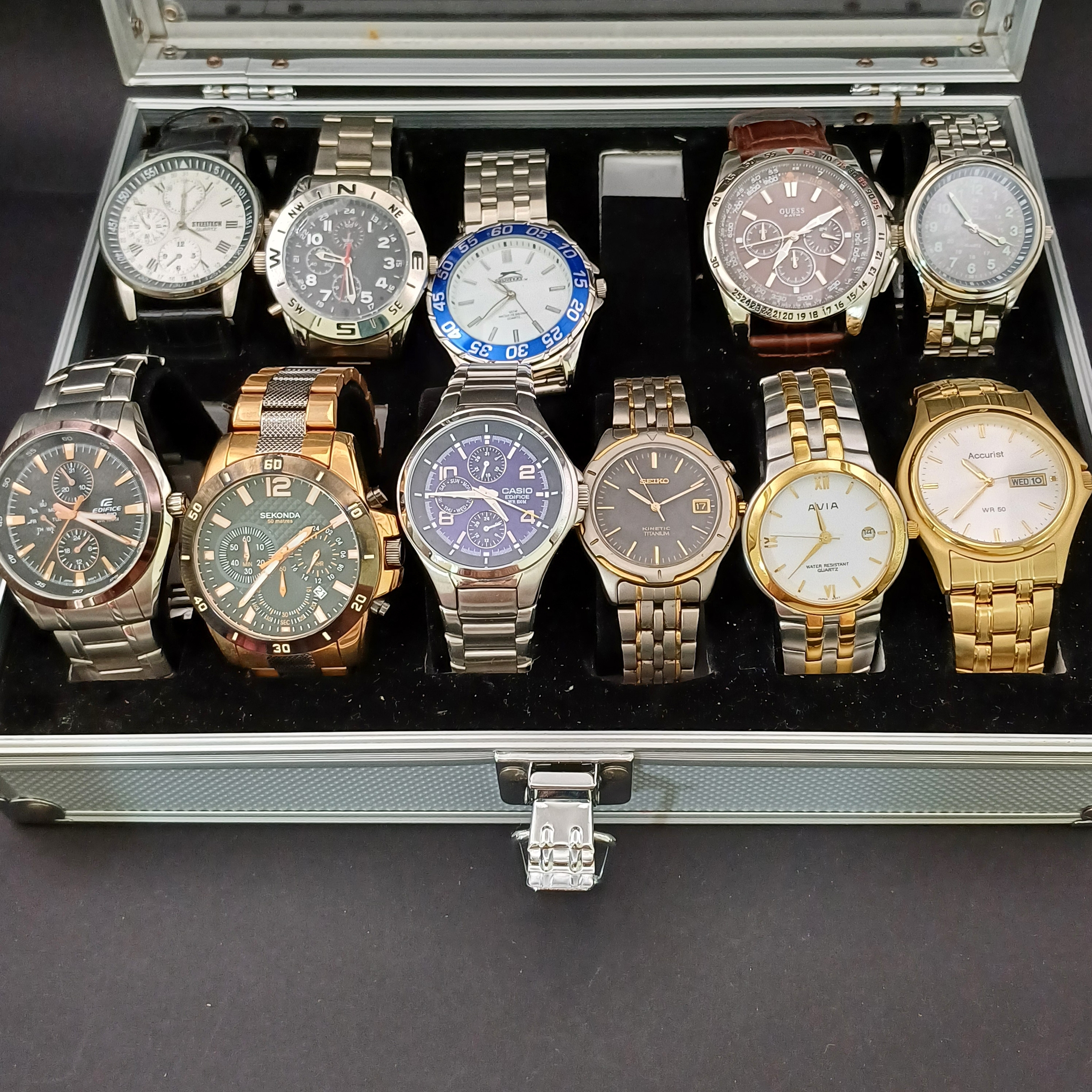 Box of Watches, 11 in all: Edifice, Sekonda, Casio, Seiko, Accurist, Avia, Mercier, Guess, Slazenger, Steeltech. The steel box is also included.