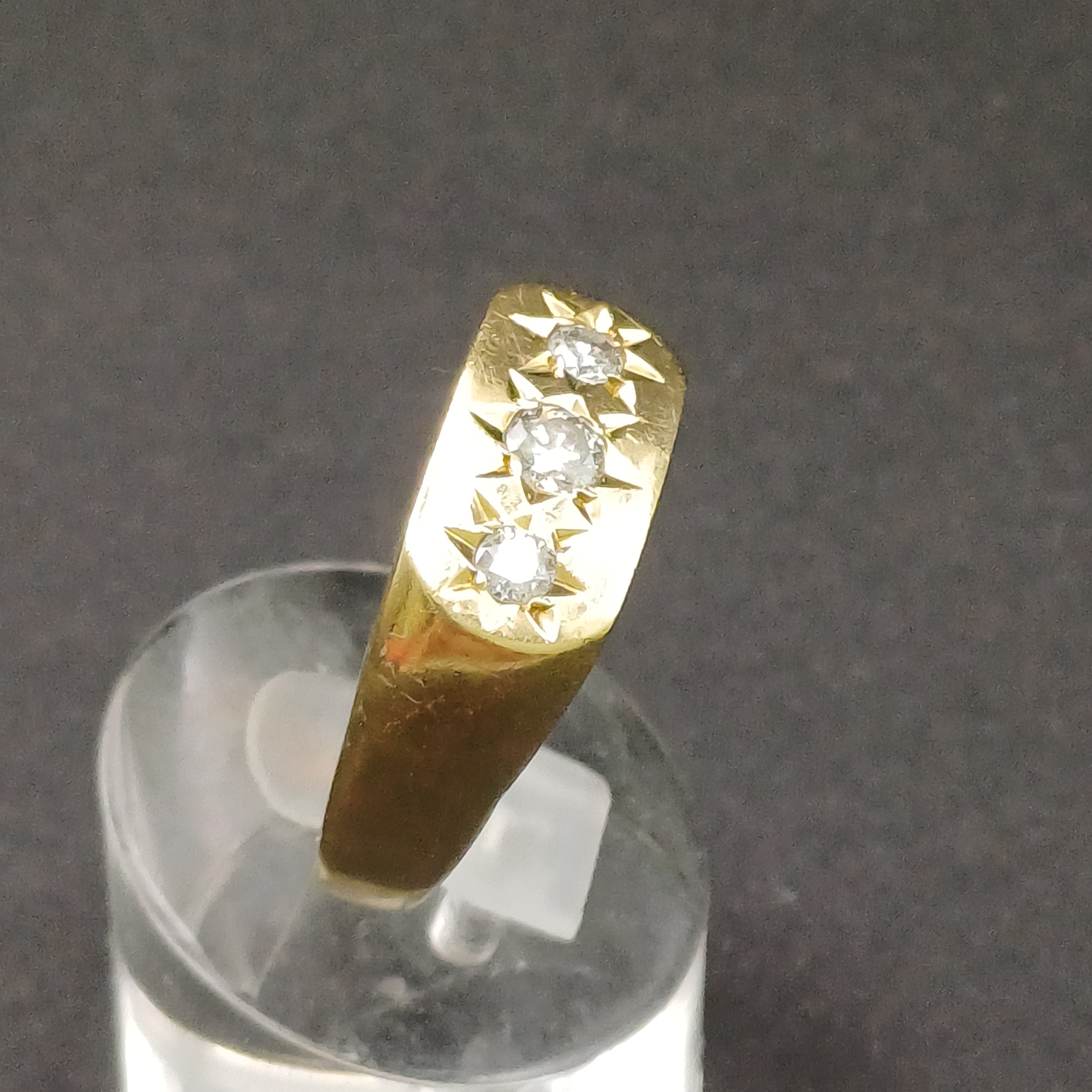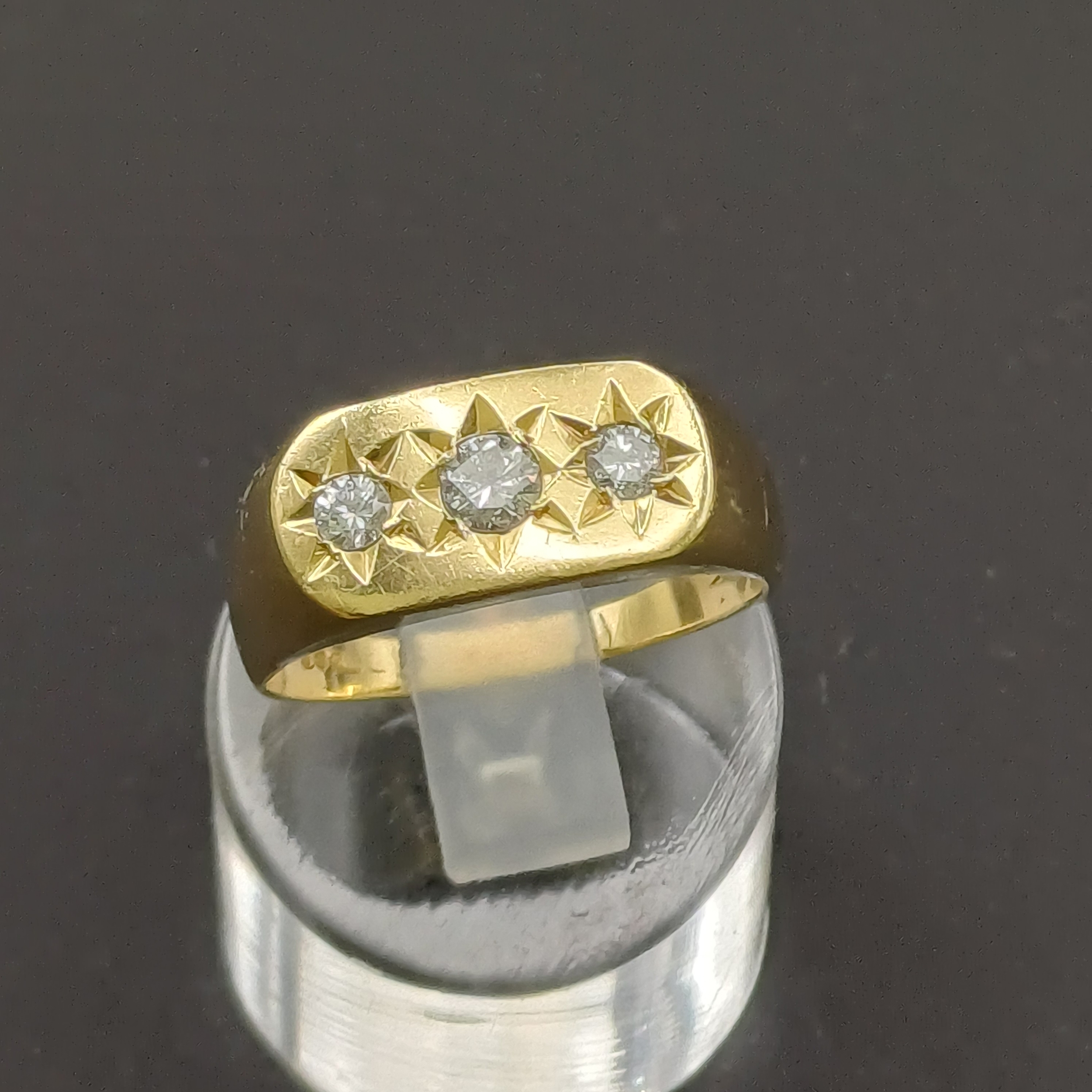 Gypsy Style Three Stone Diamond Ring with star design around the diamonds. Diamonds are VS2 Colour D approximately 1.5 carat in total