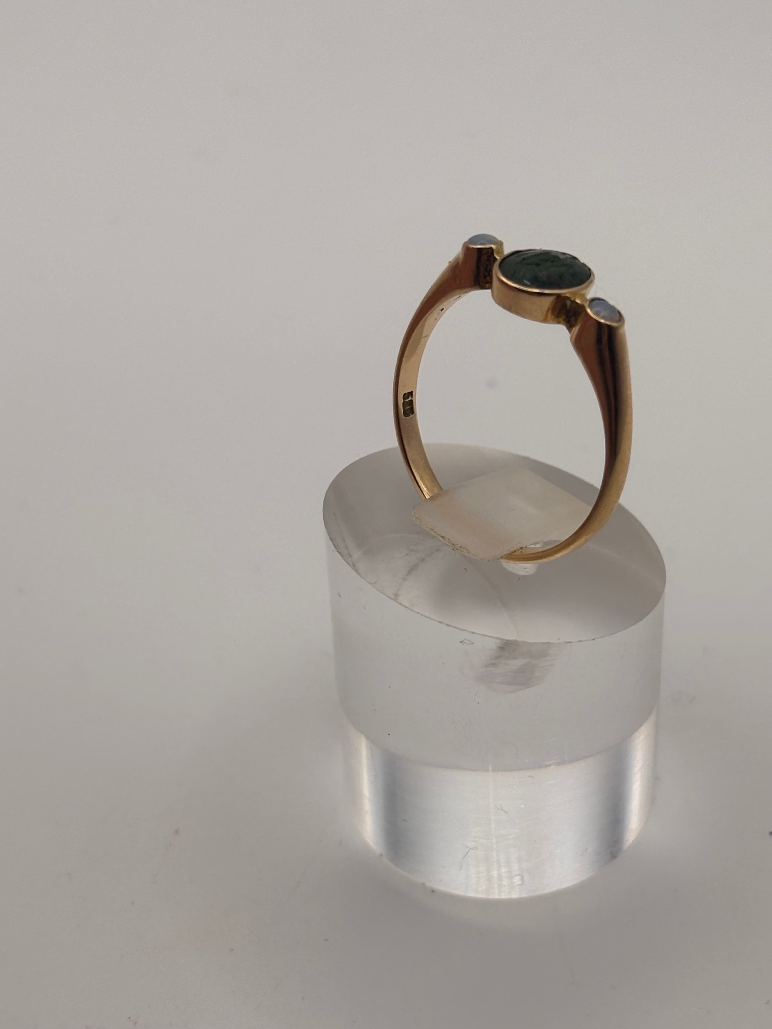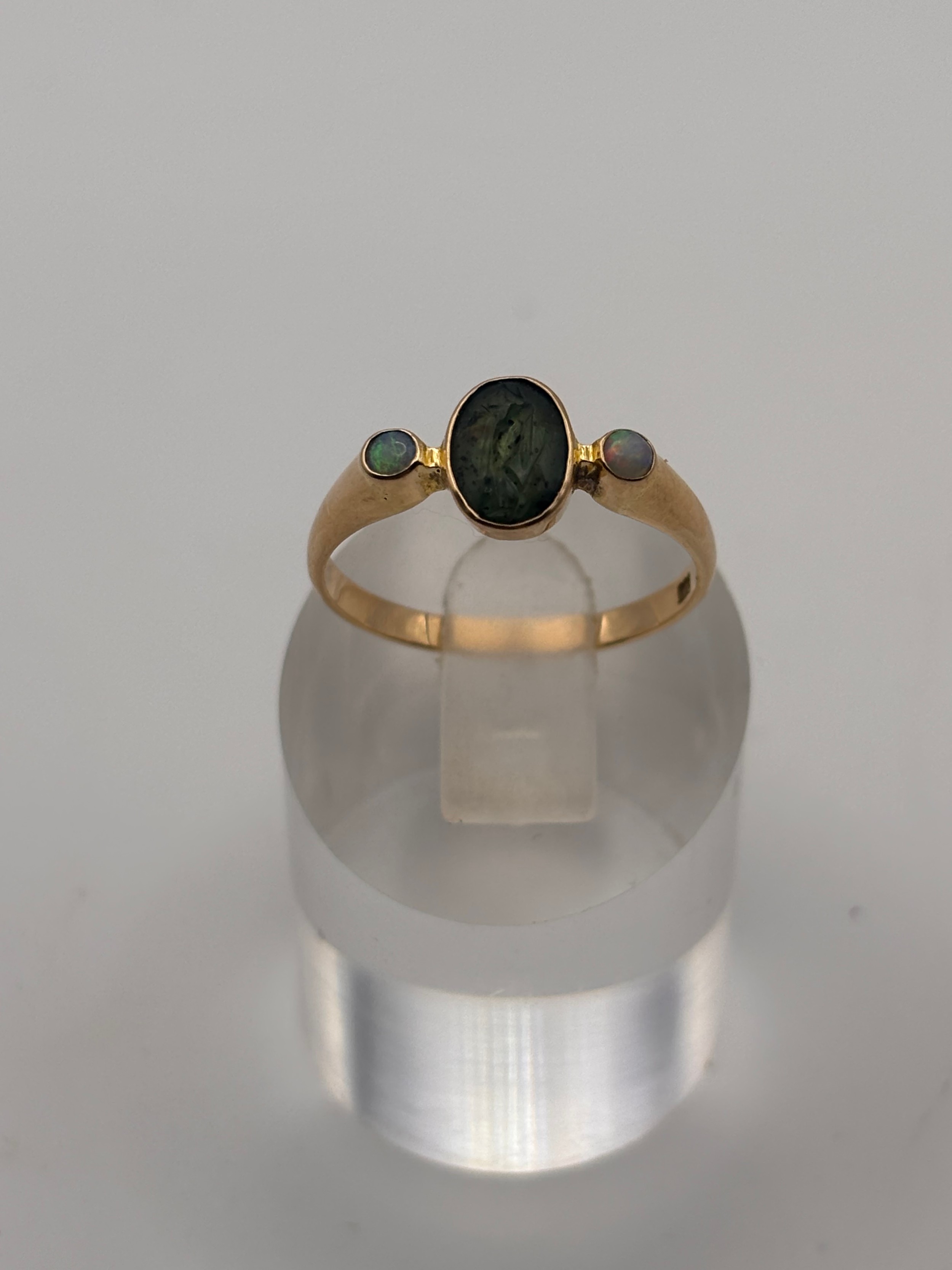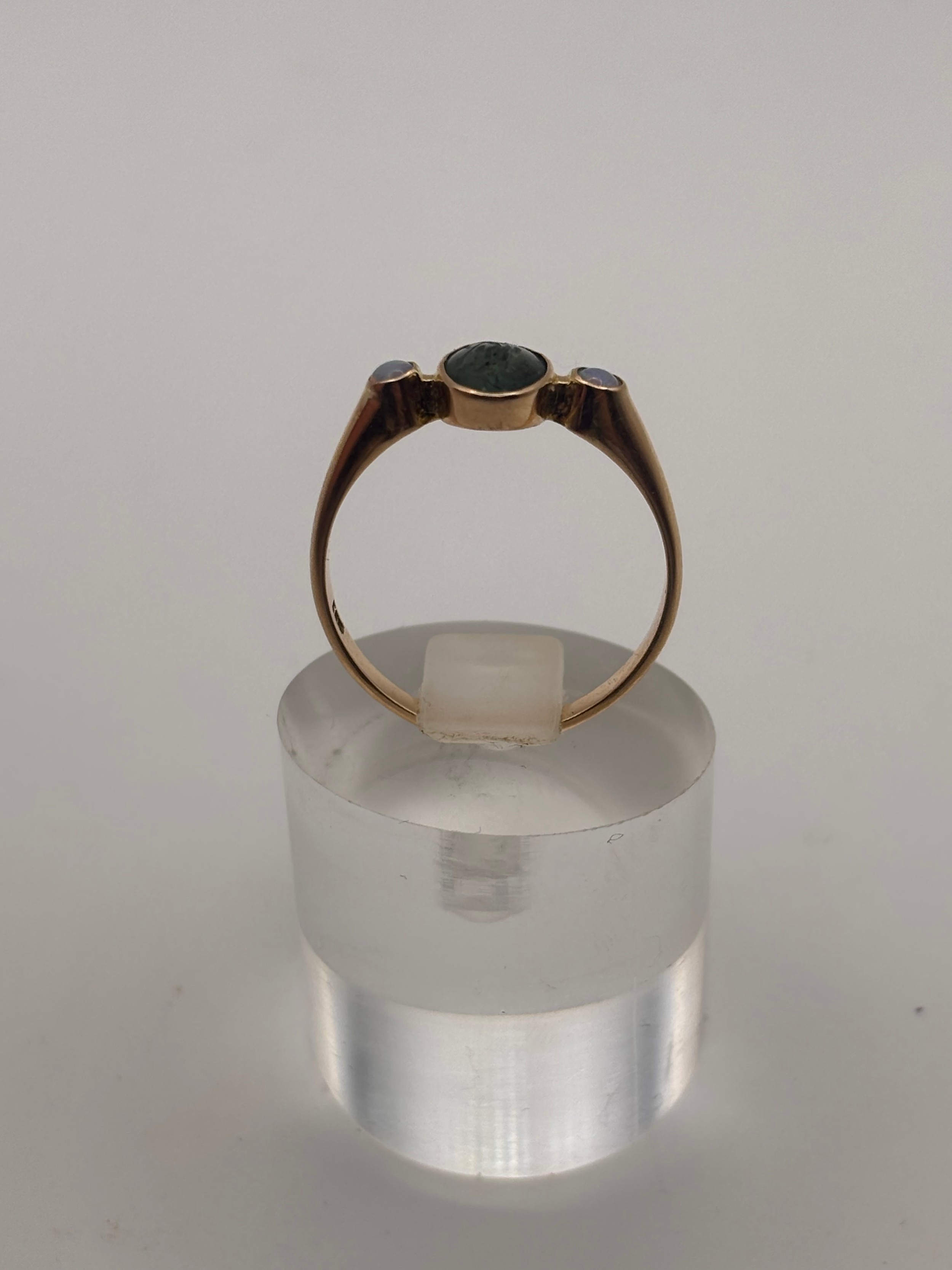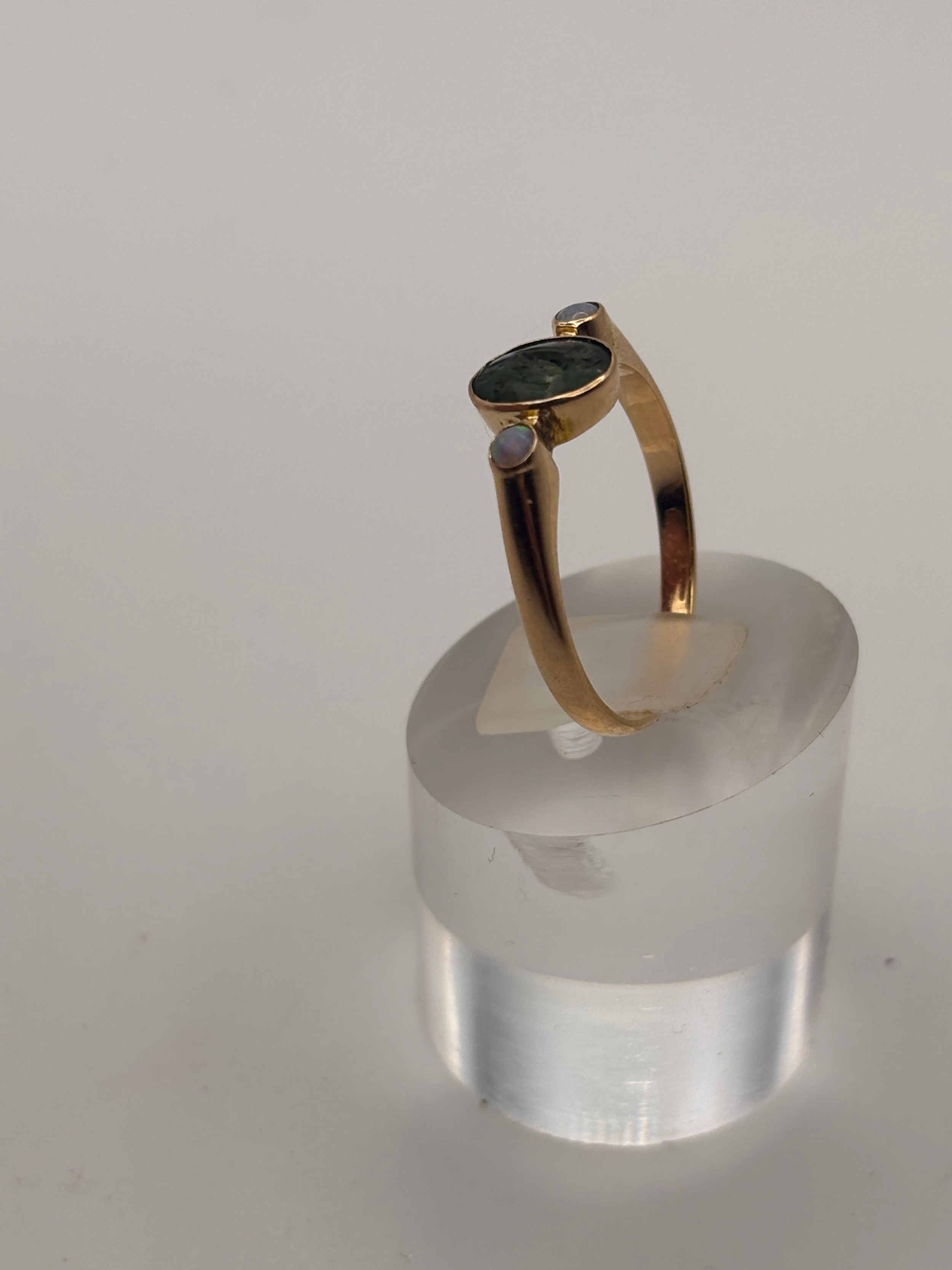 14ct yellow gold dark green gem flanked by smaller opal gemstones.