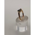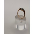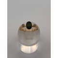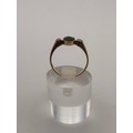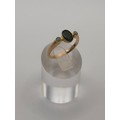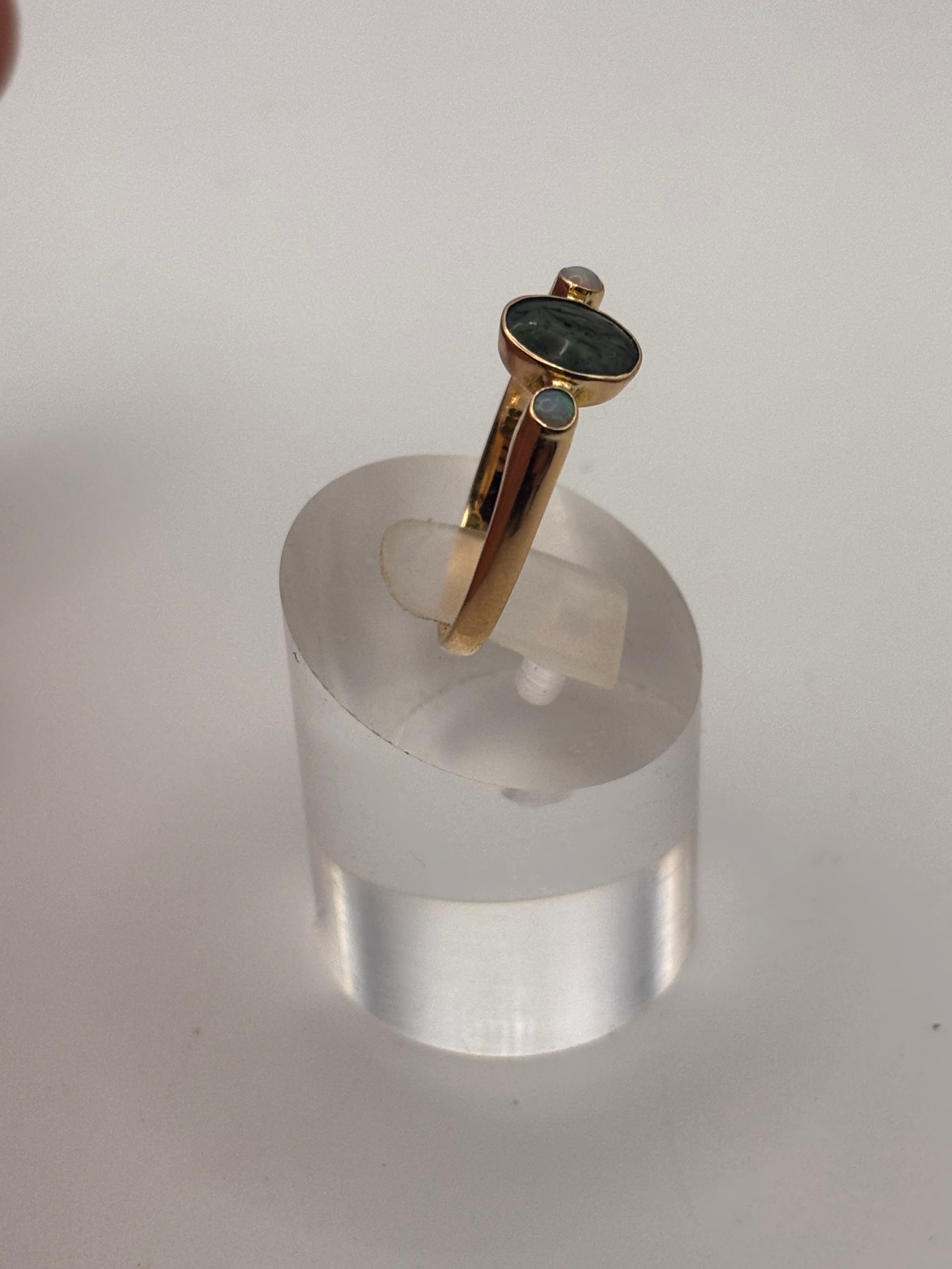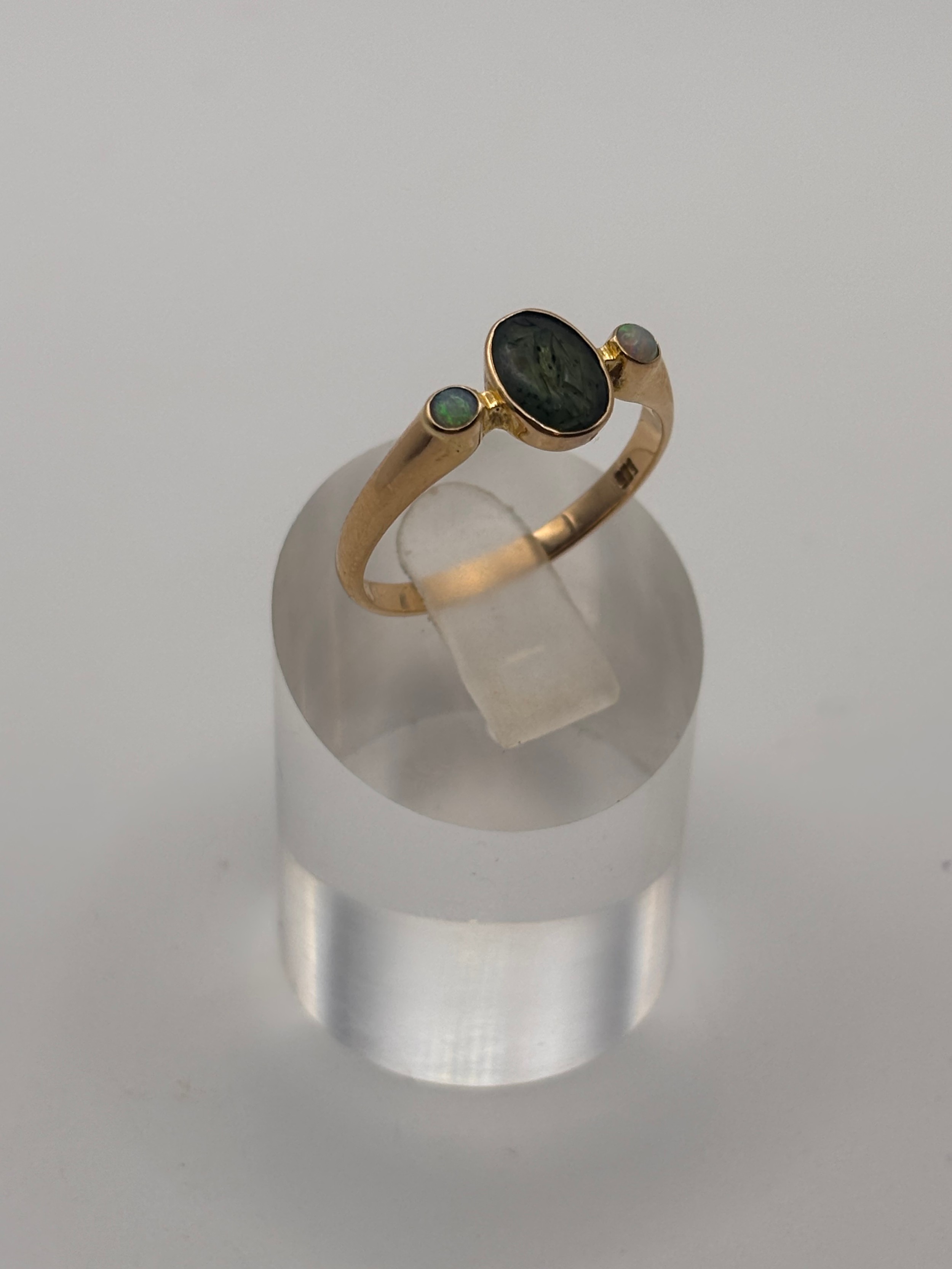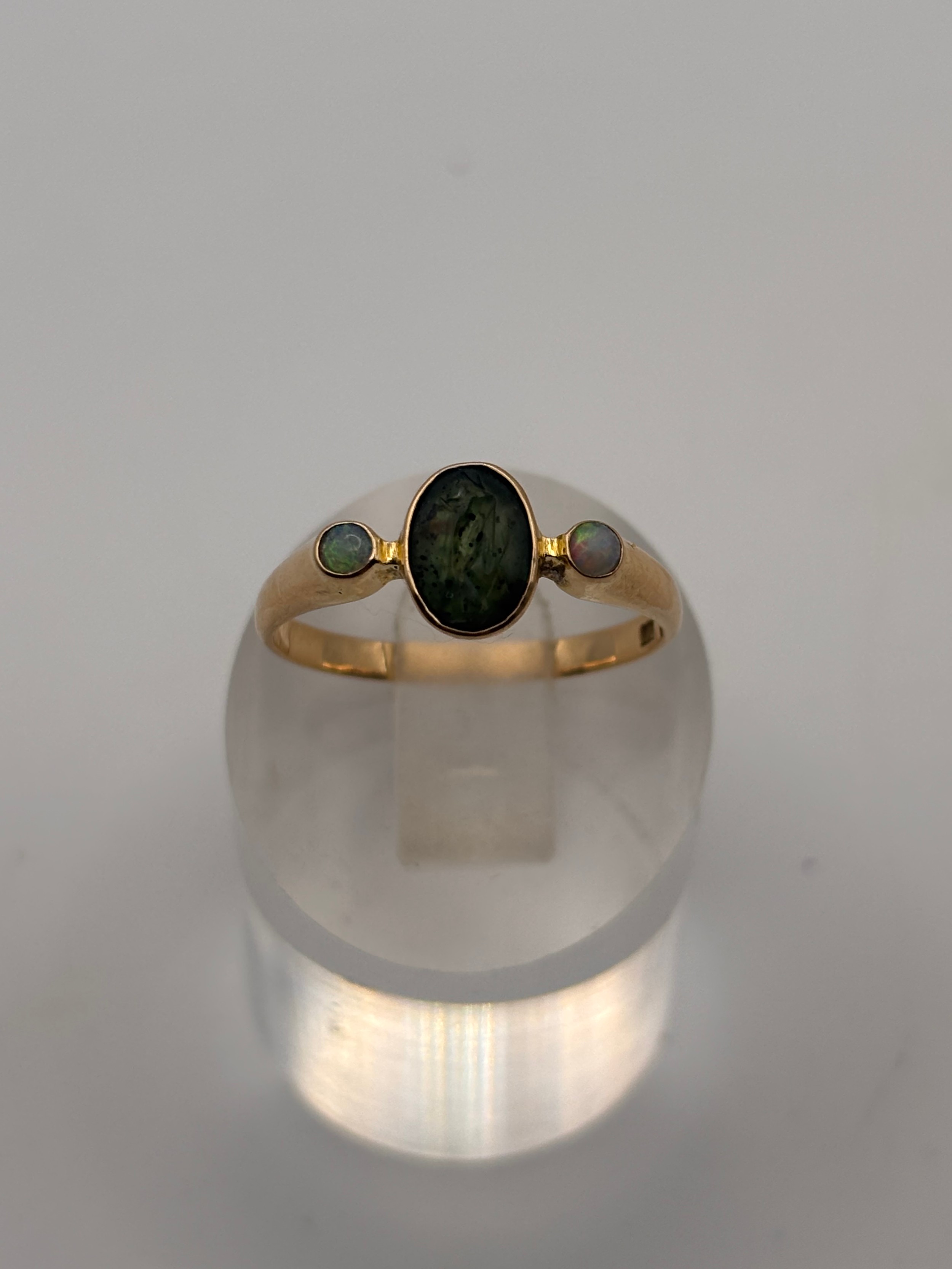 14ct yellow gold dark green gem flanked by smaller opal gemstones.