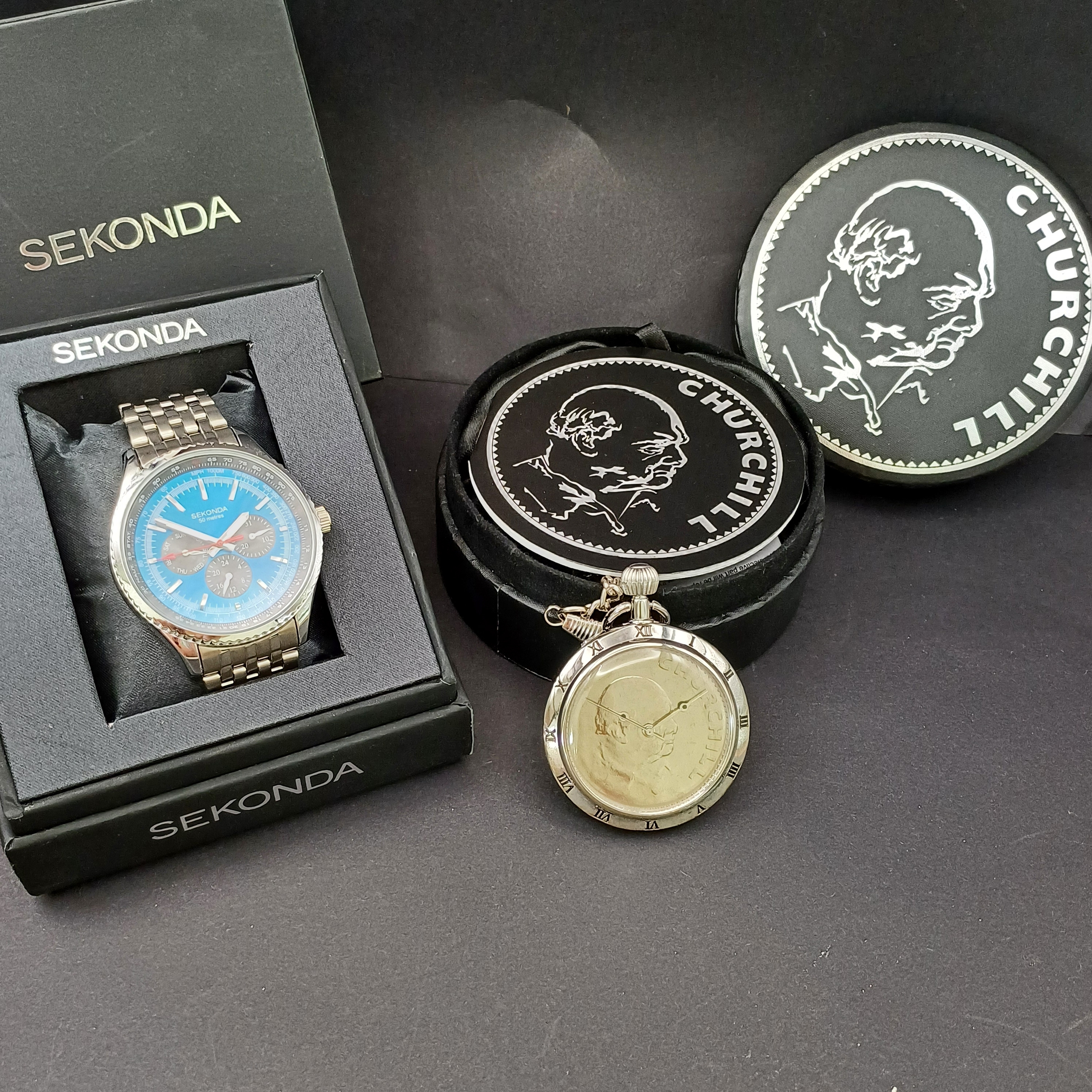 Winston Churchill Silver Medal Pocket Watch and Sekonda 50 metres Watch. Both in original boxes