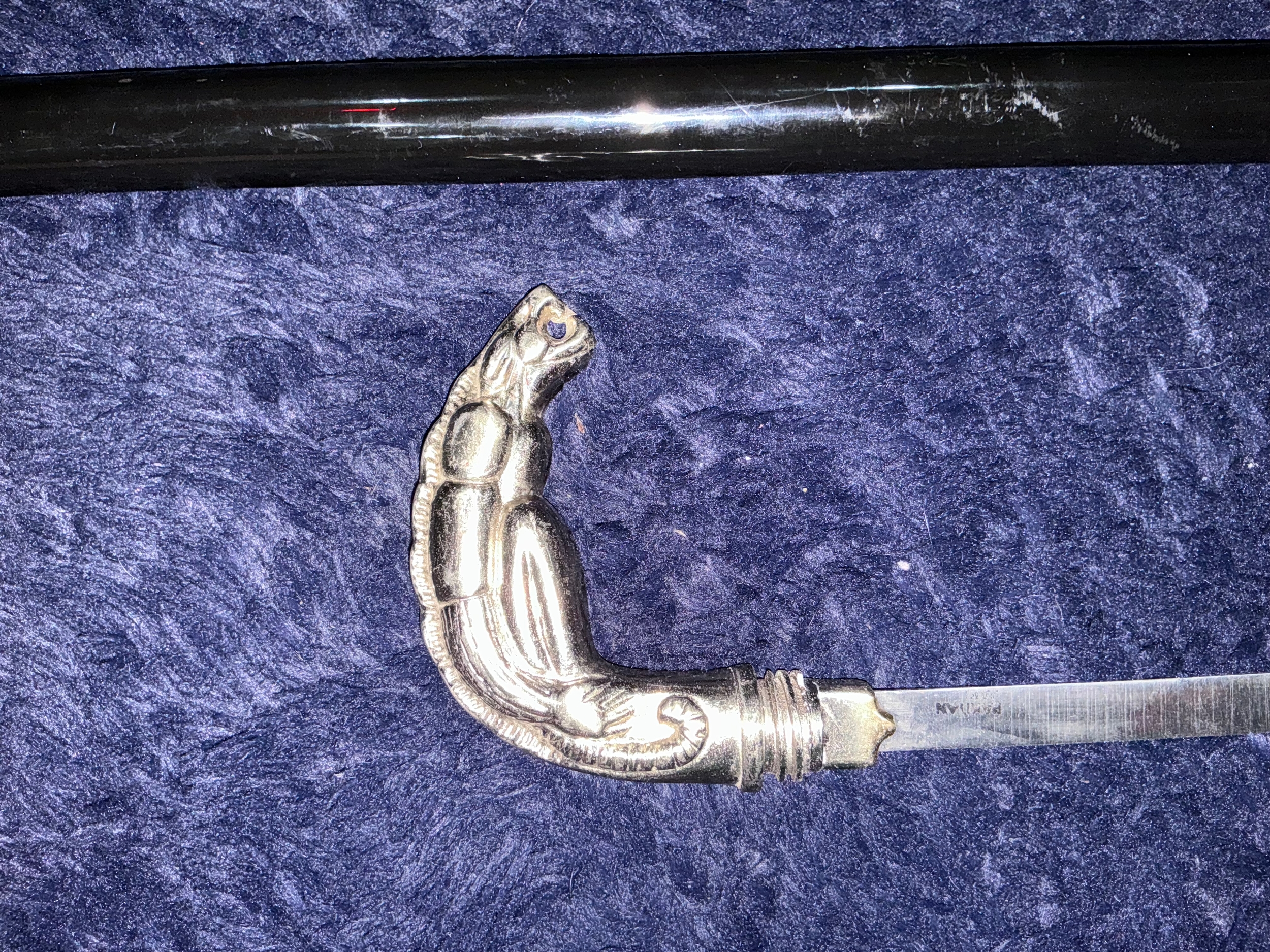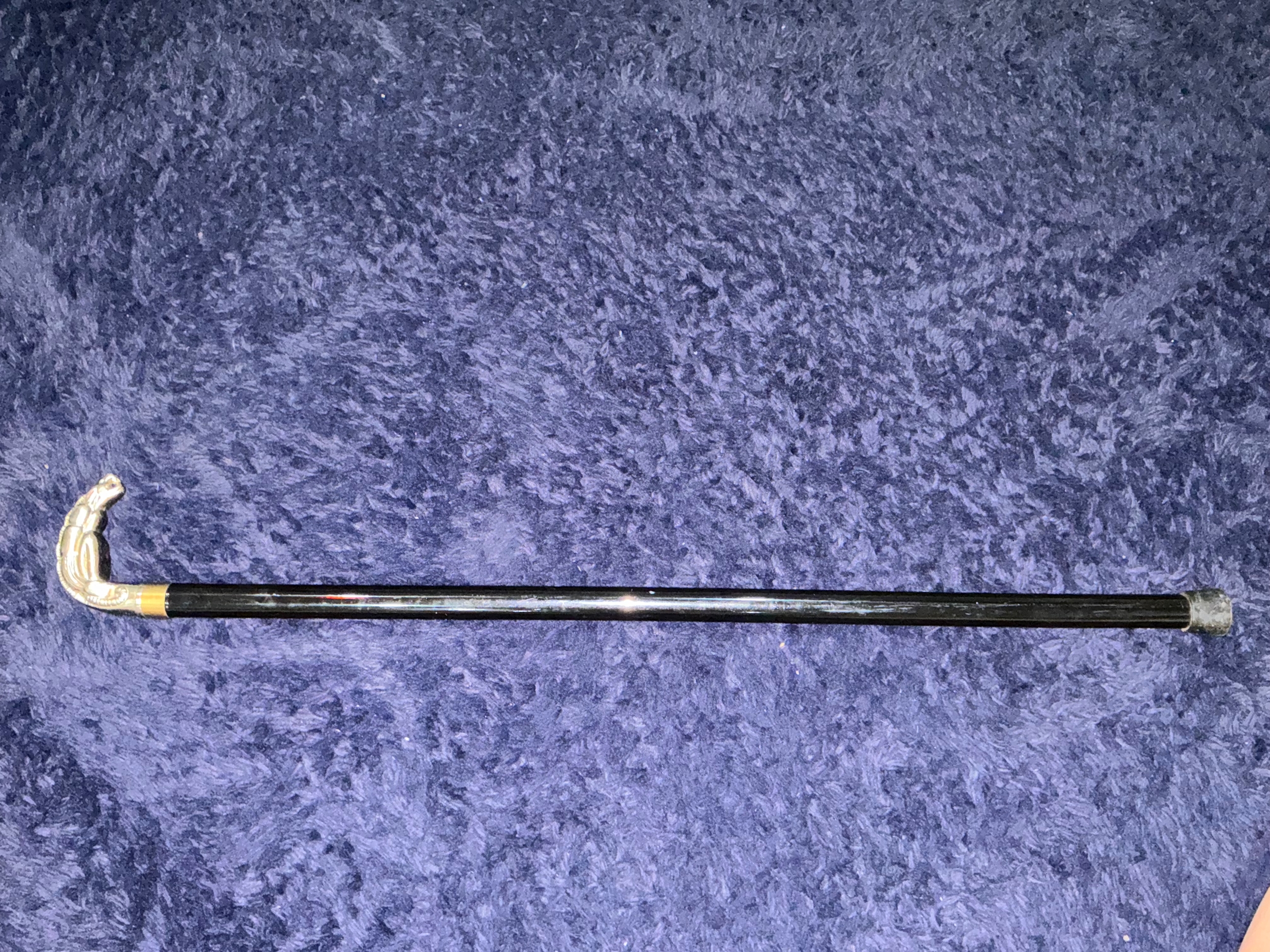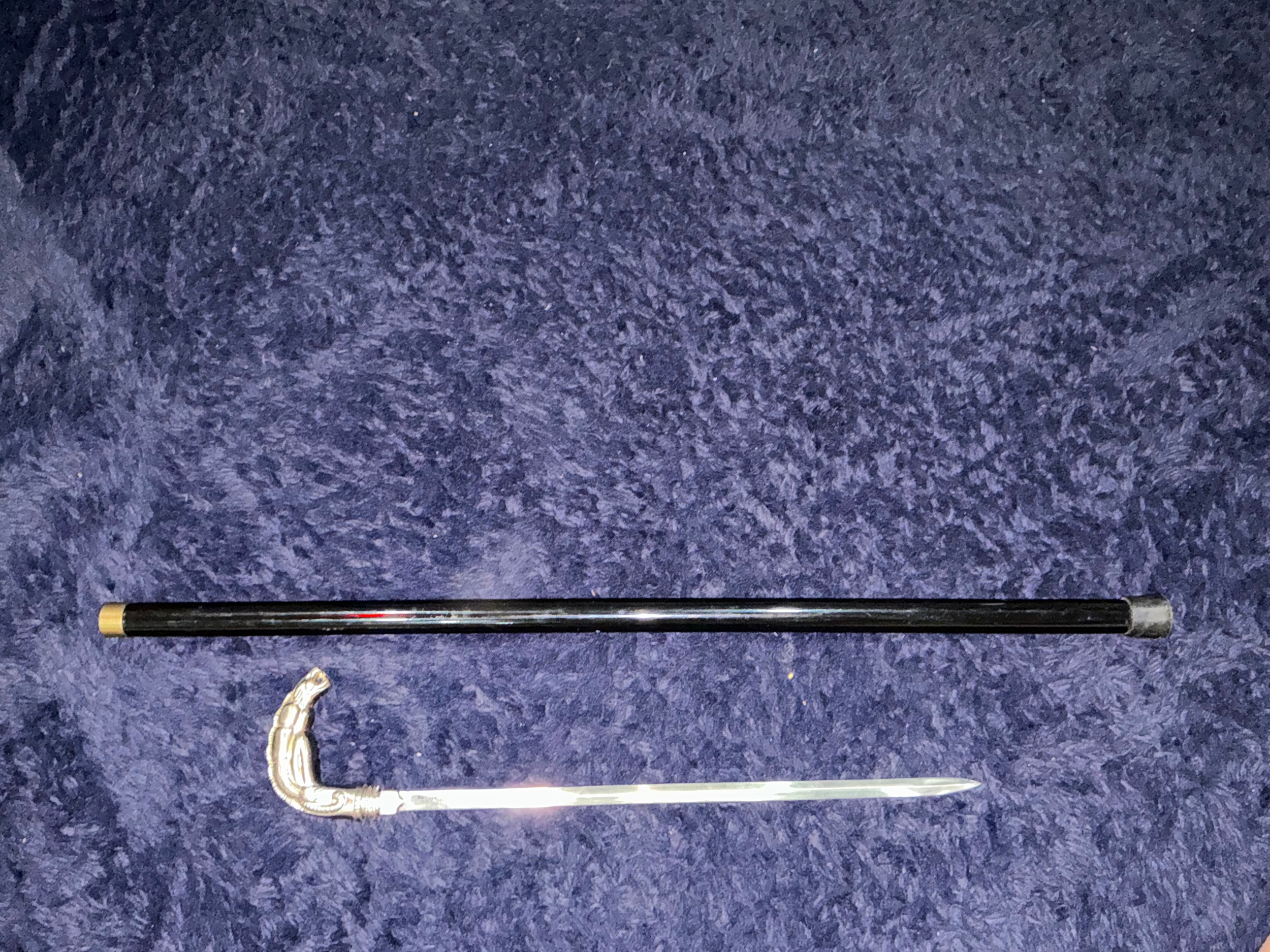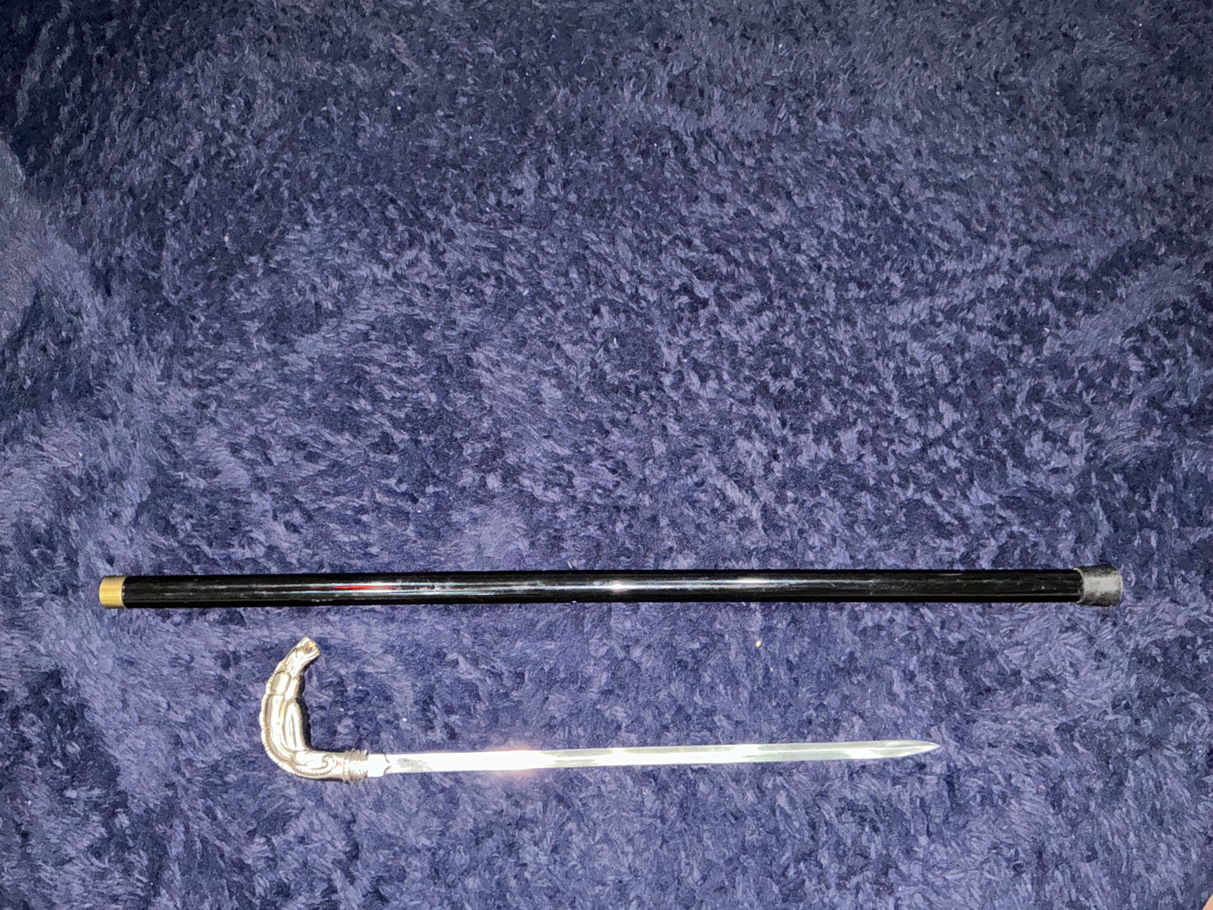 Another fine piece, sword stick believe to have been made in Pakistan (possibly etched onto blade) This lighter weight sword stick has a screw on blade cover and research would have us believe that this is a one of a kind handle design.