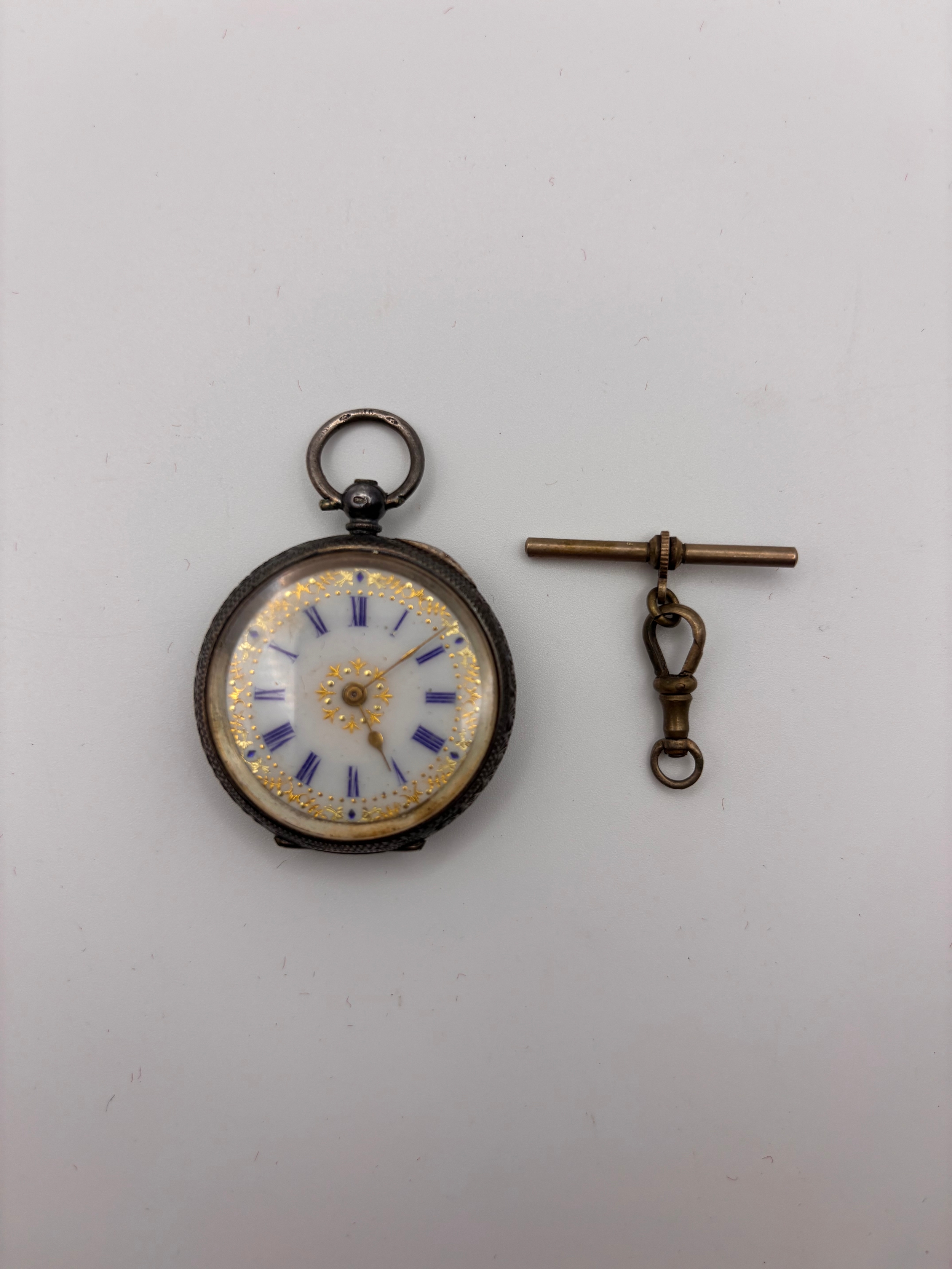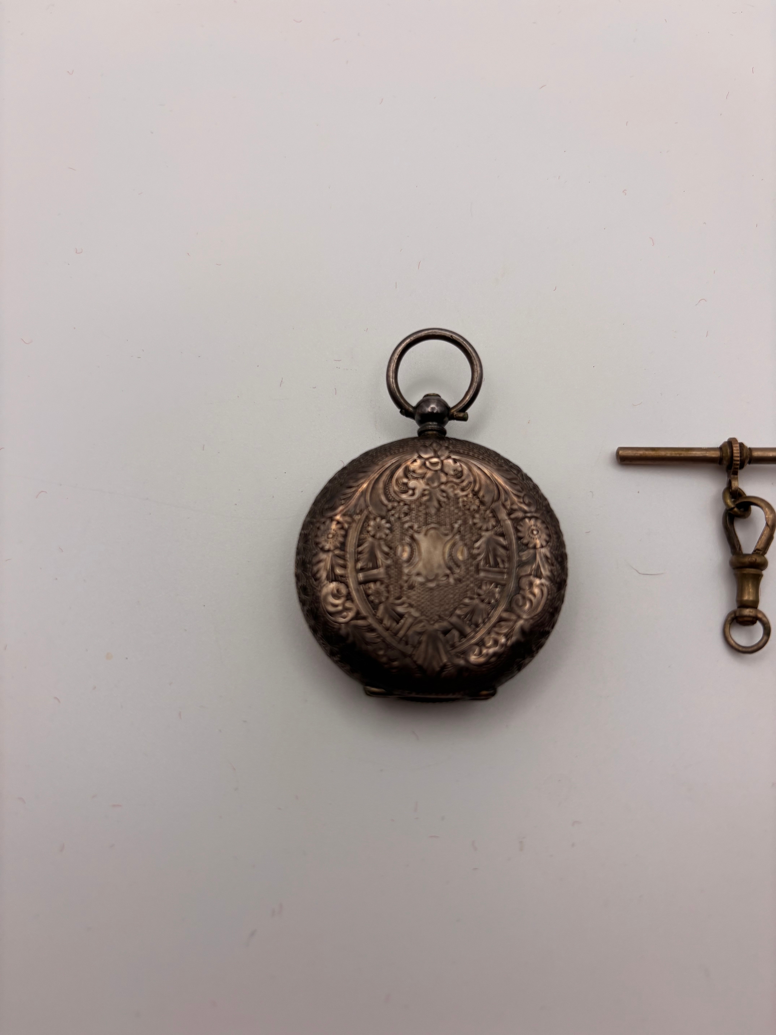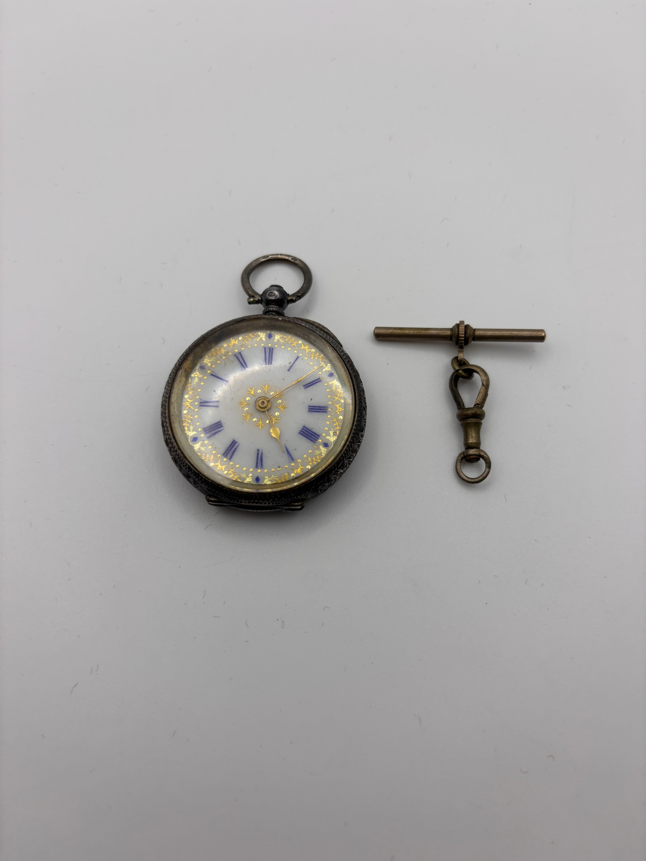 Silver ladies antique pocket watch. This is a lovely example. Comes untested as missing the key.
