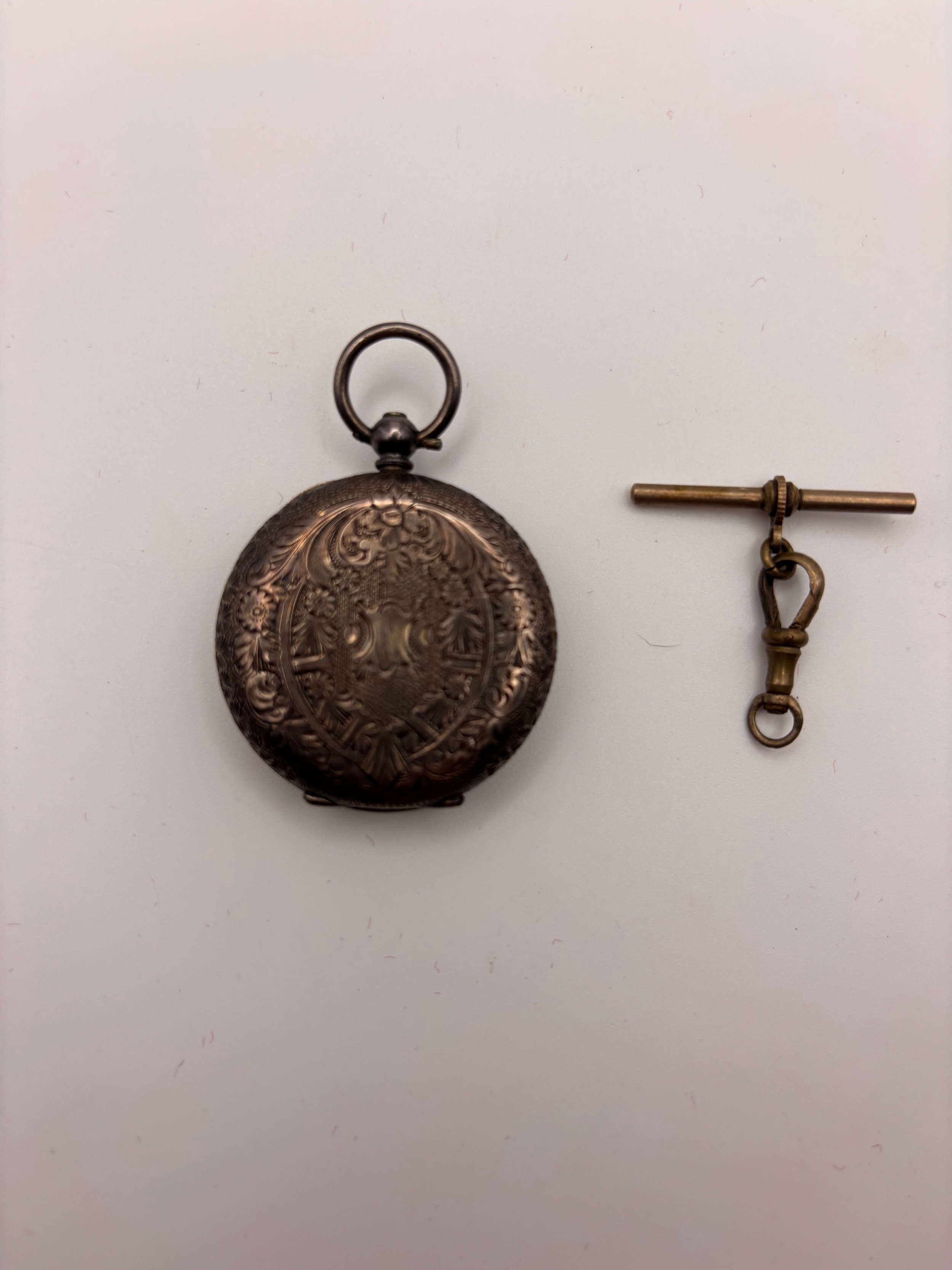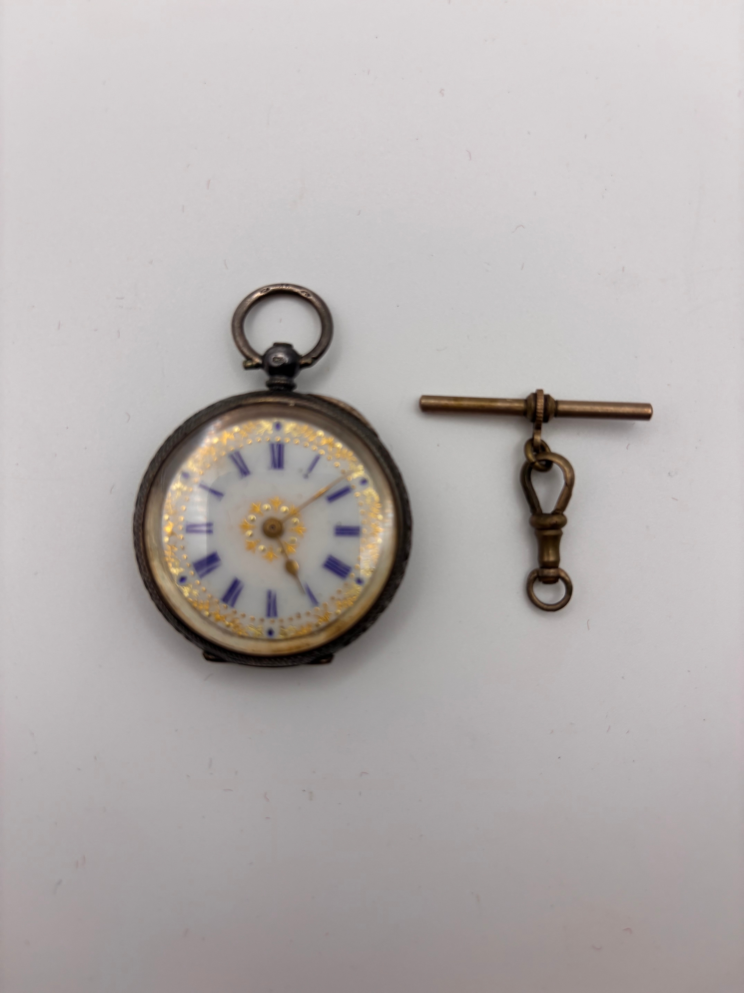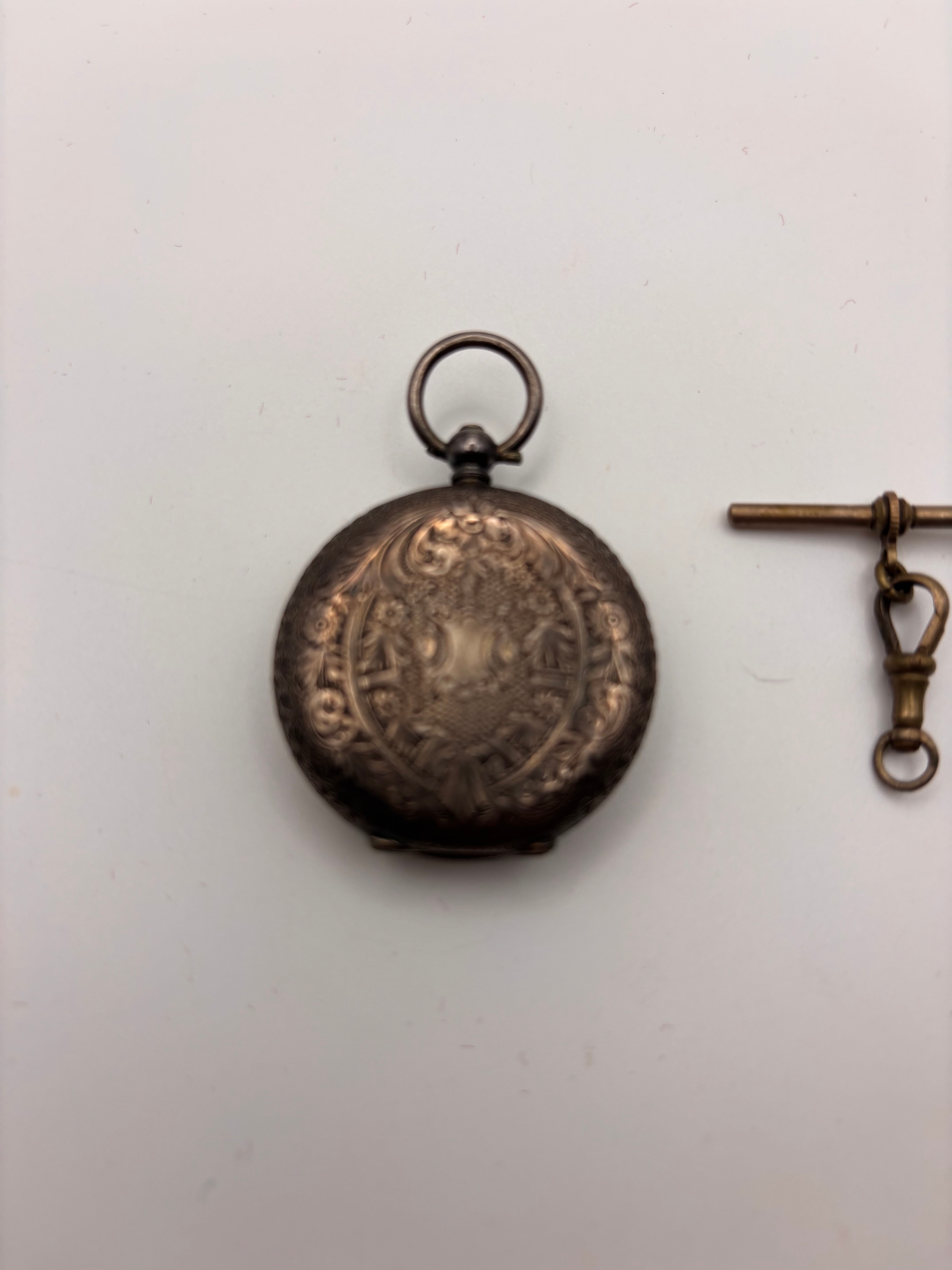 Silver ladies antique pocket watch. This is a lovely example. Comes untested as missing the key.