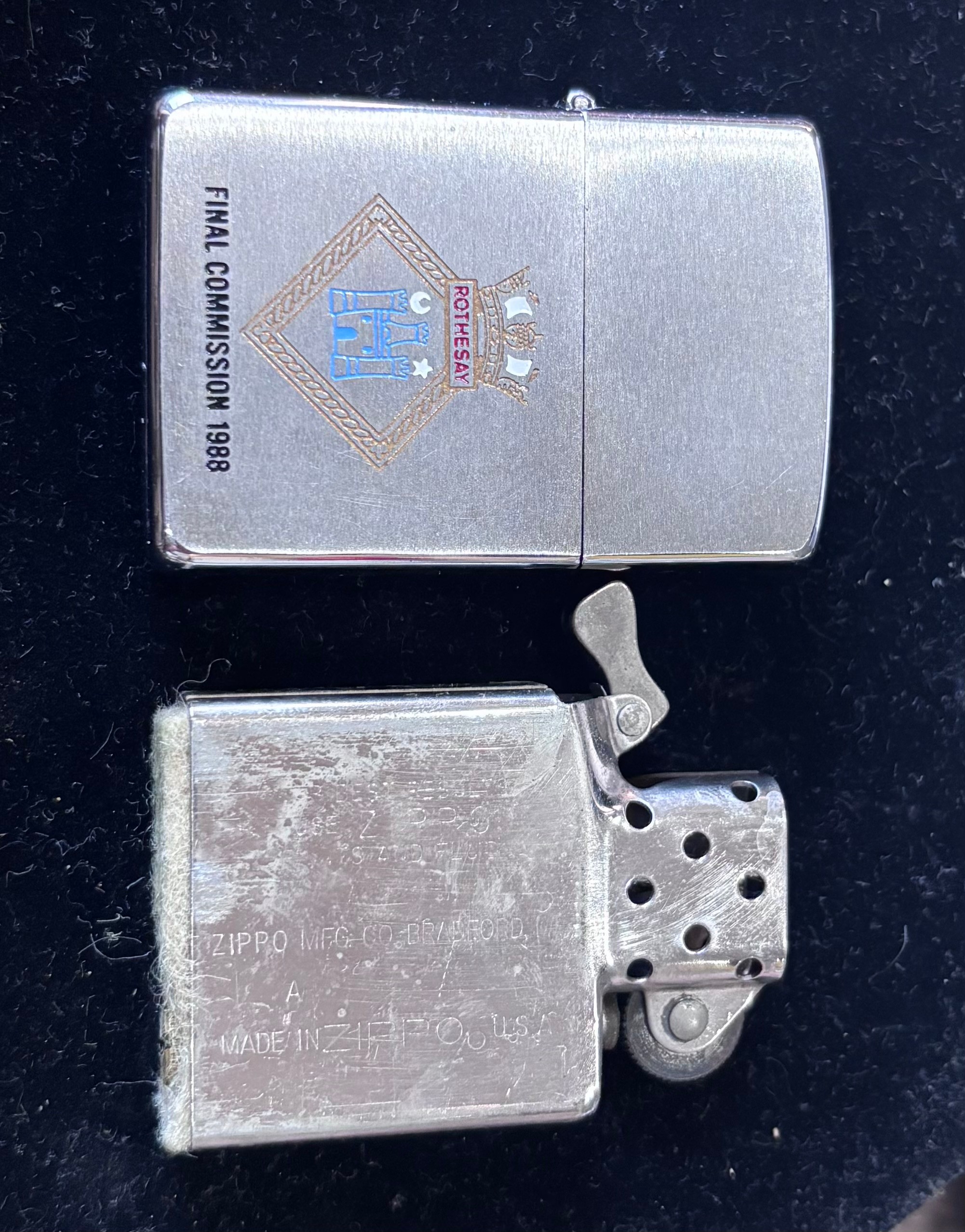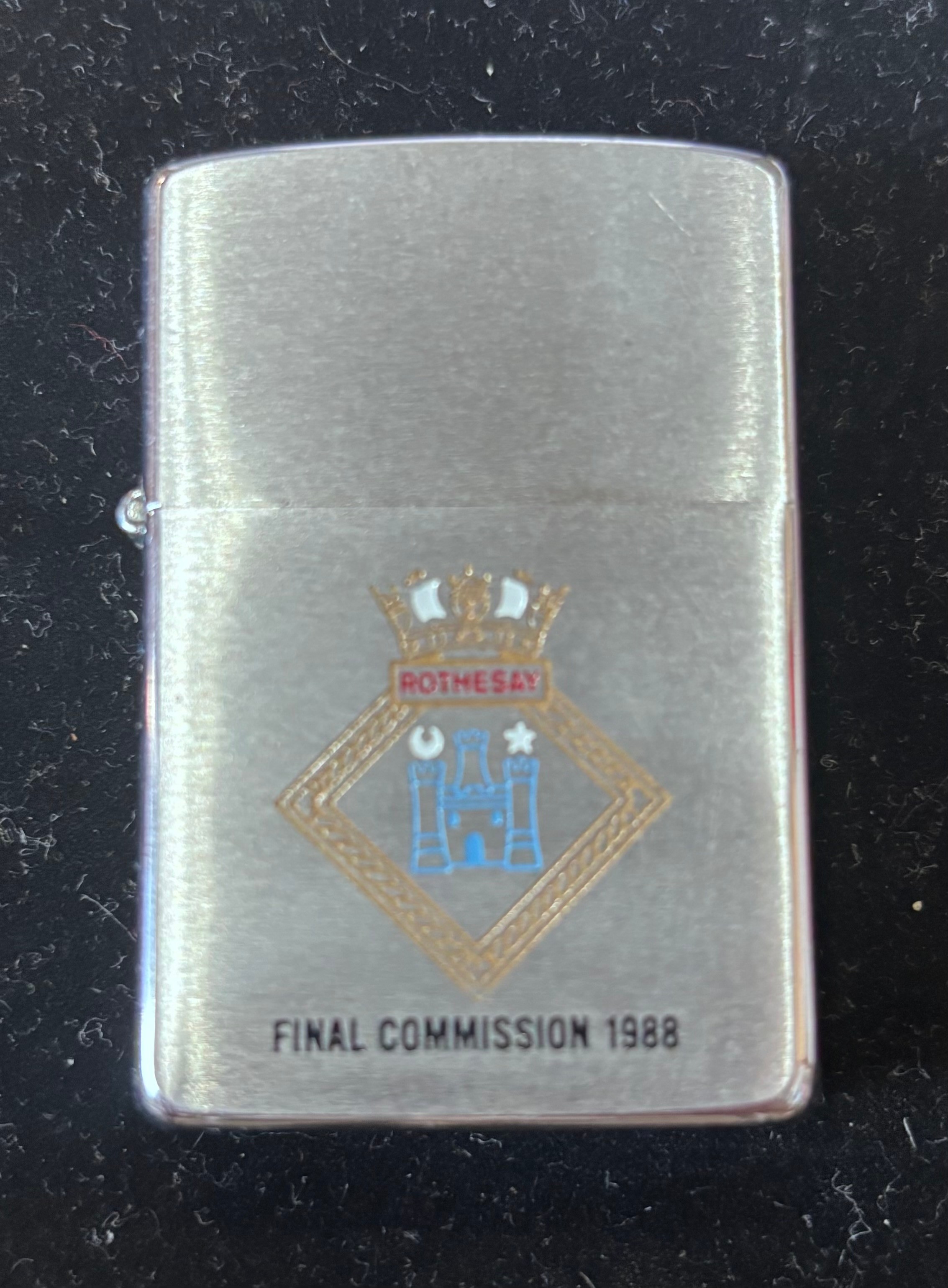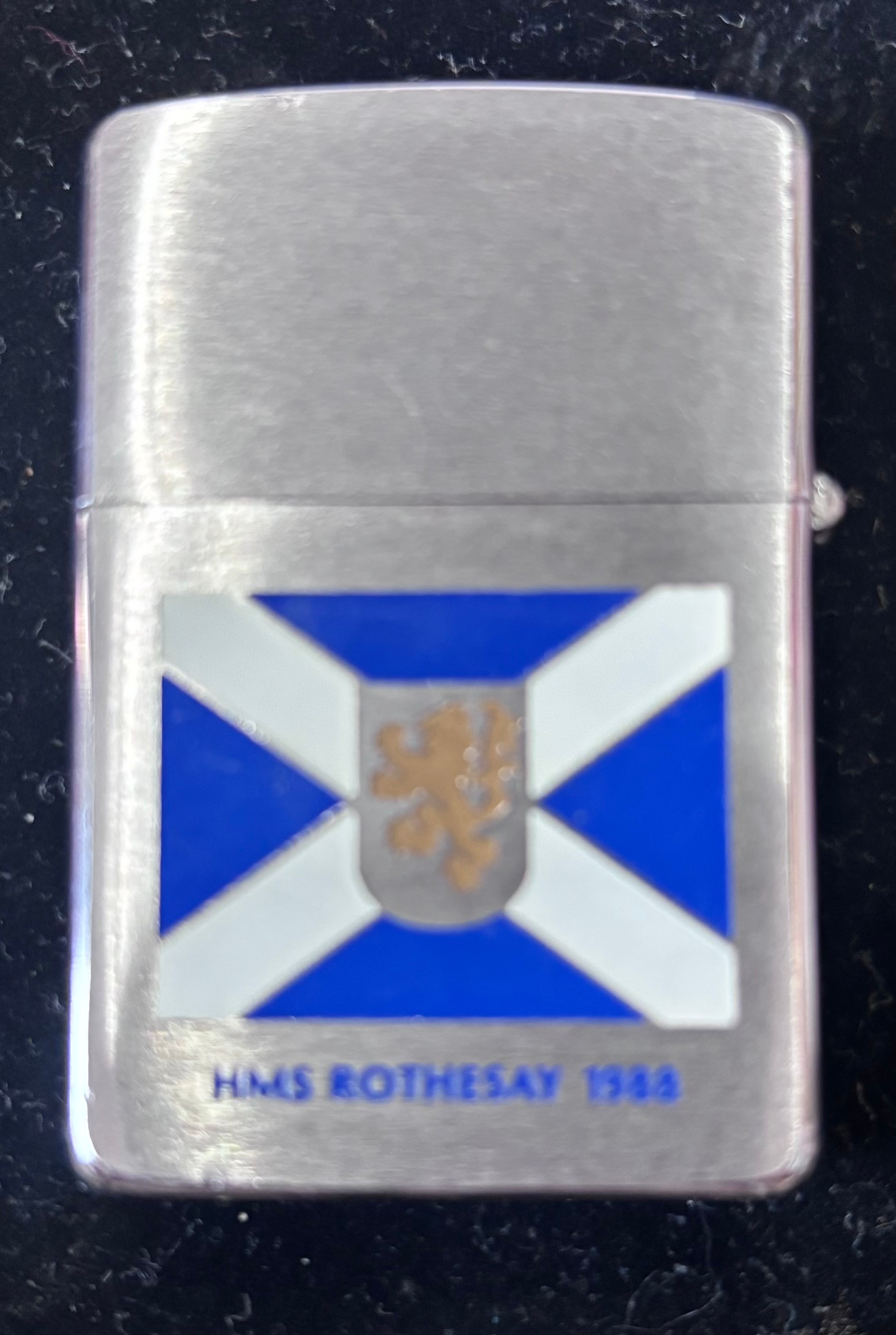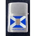 Genuine Zippo windproof lighter featuring the Scottish flag and Rothesay crest to commemorate the final commision of the HMS Rothesay in 1988.