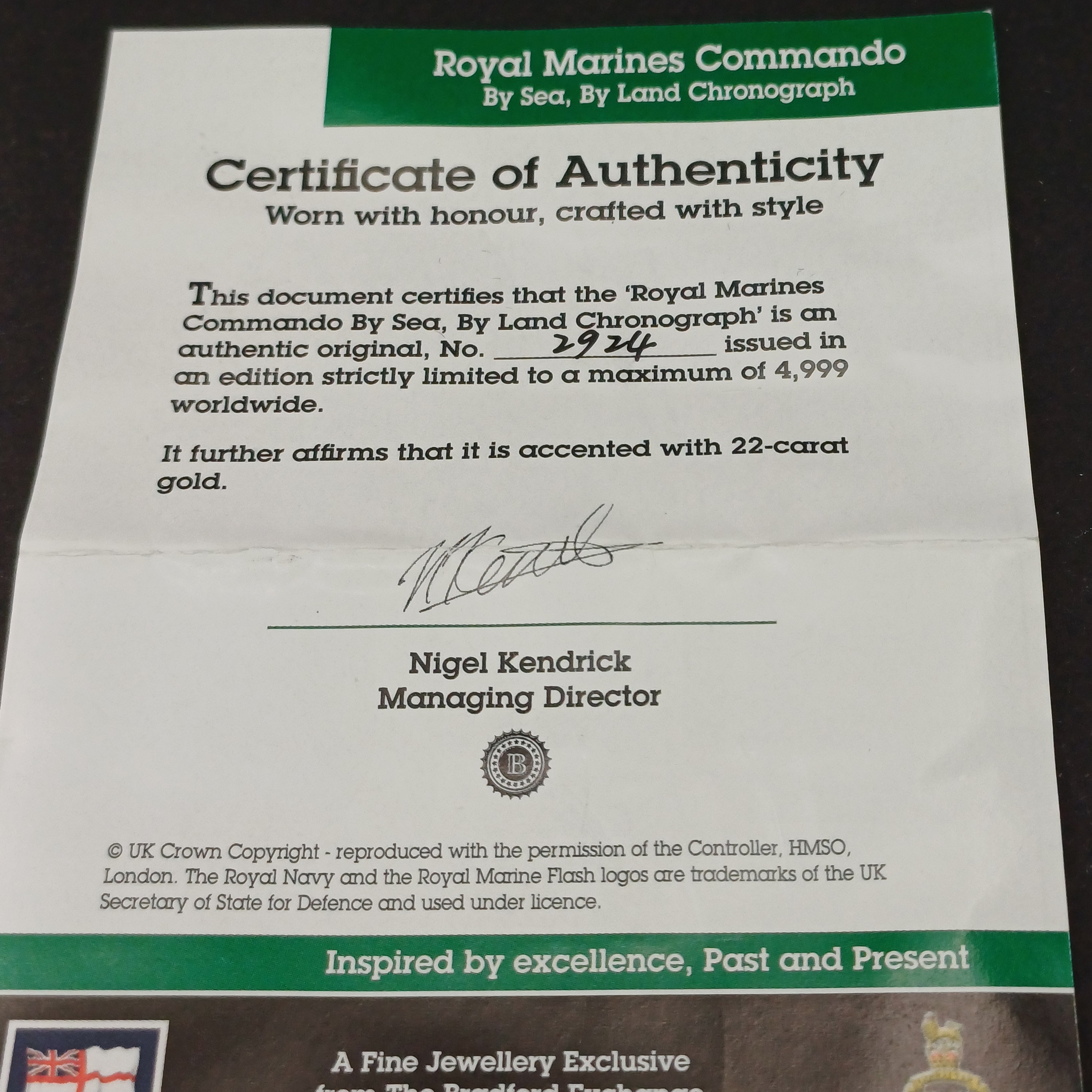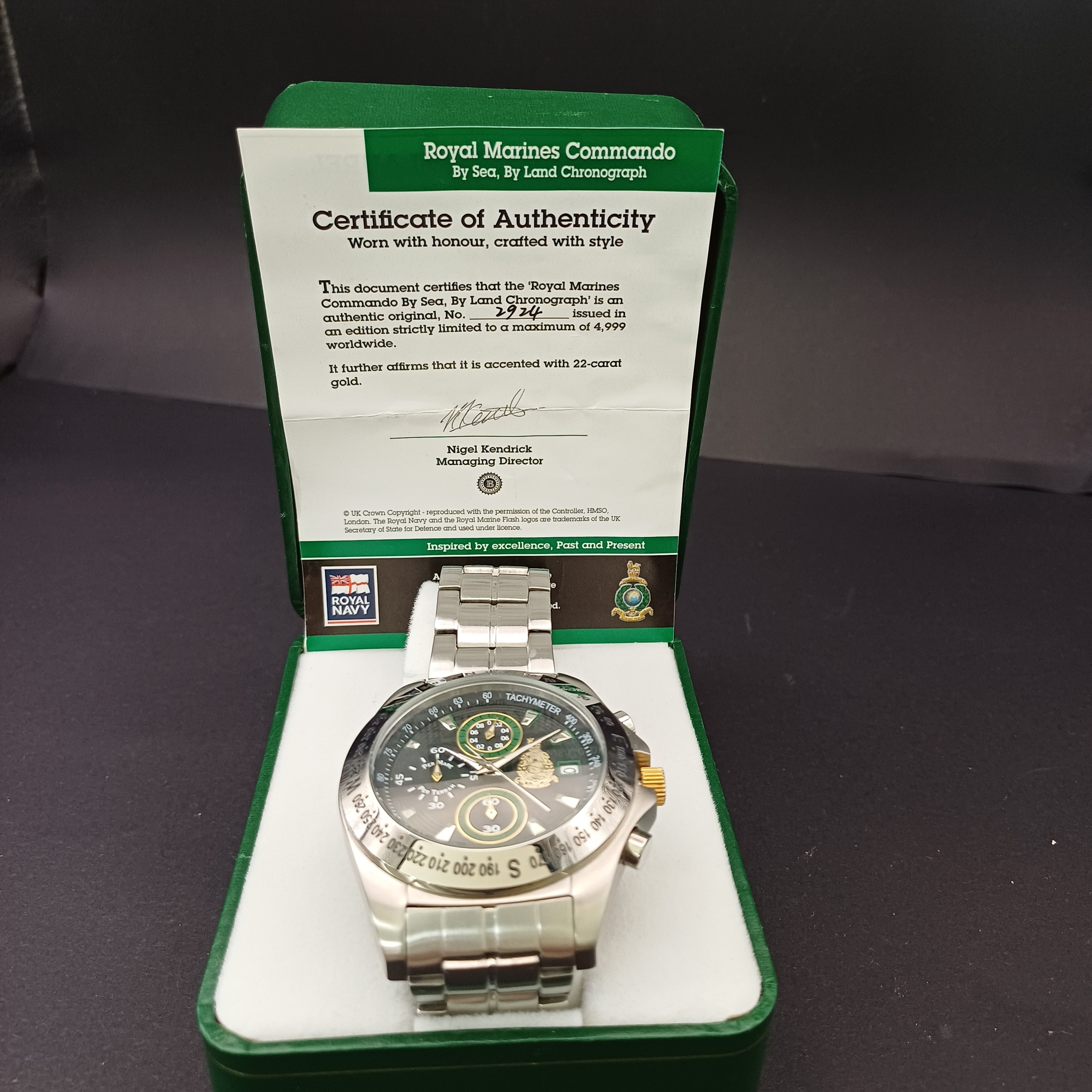 Limited Edition Royal Marines Commando Watch in original box and Certificate/ This is 2924 of 4999. Excellent Condition and they are selling for quite significant prices both retail and at other auctions.