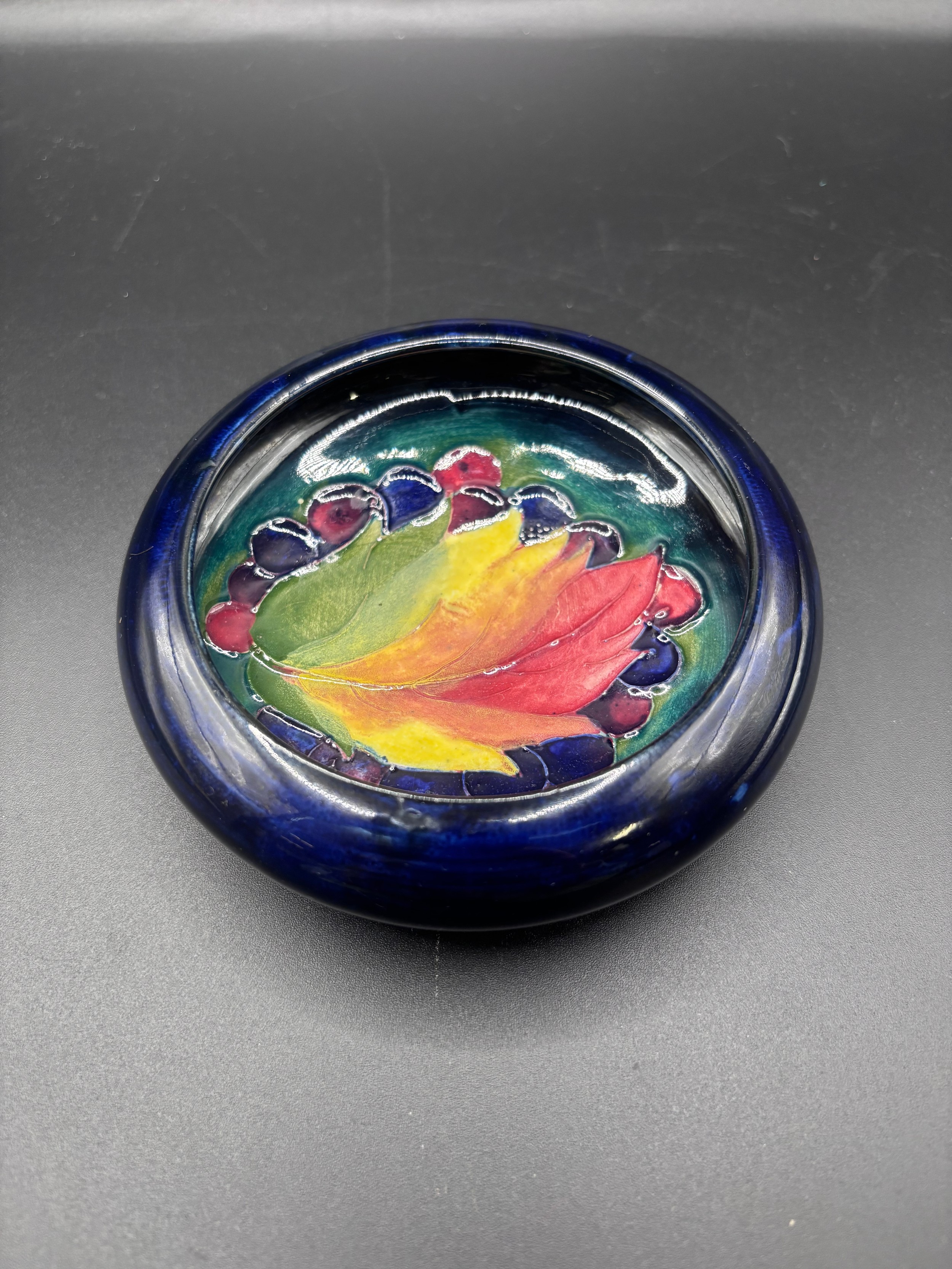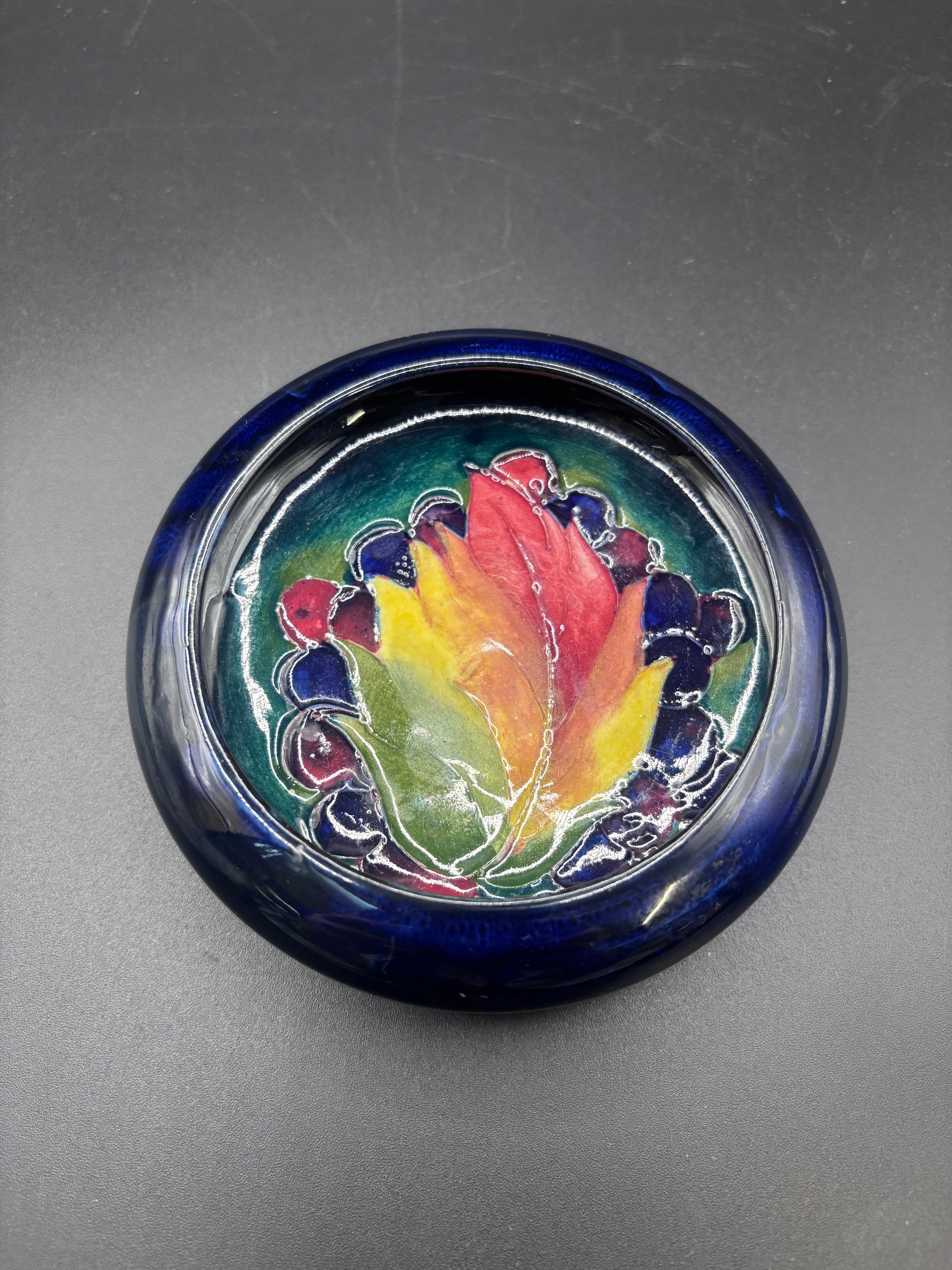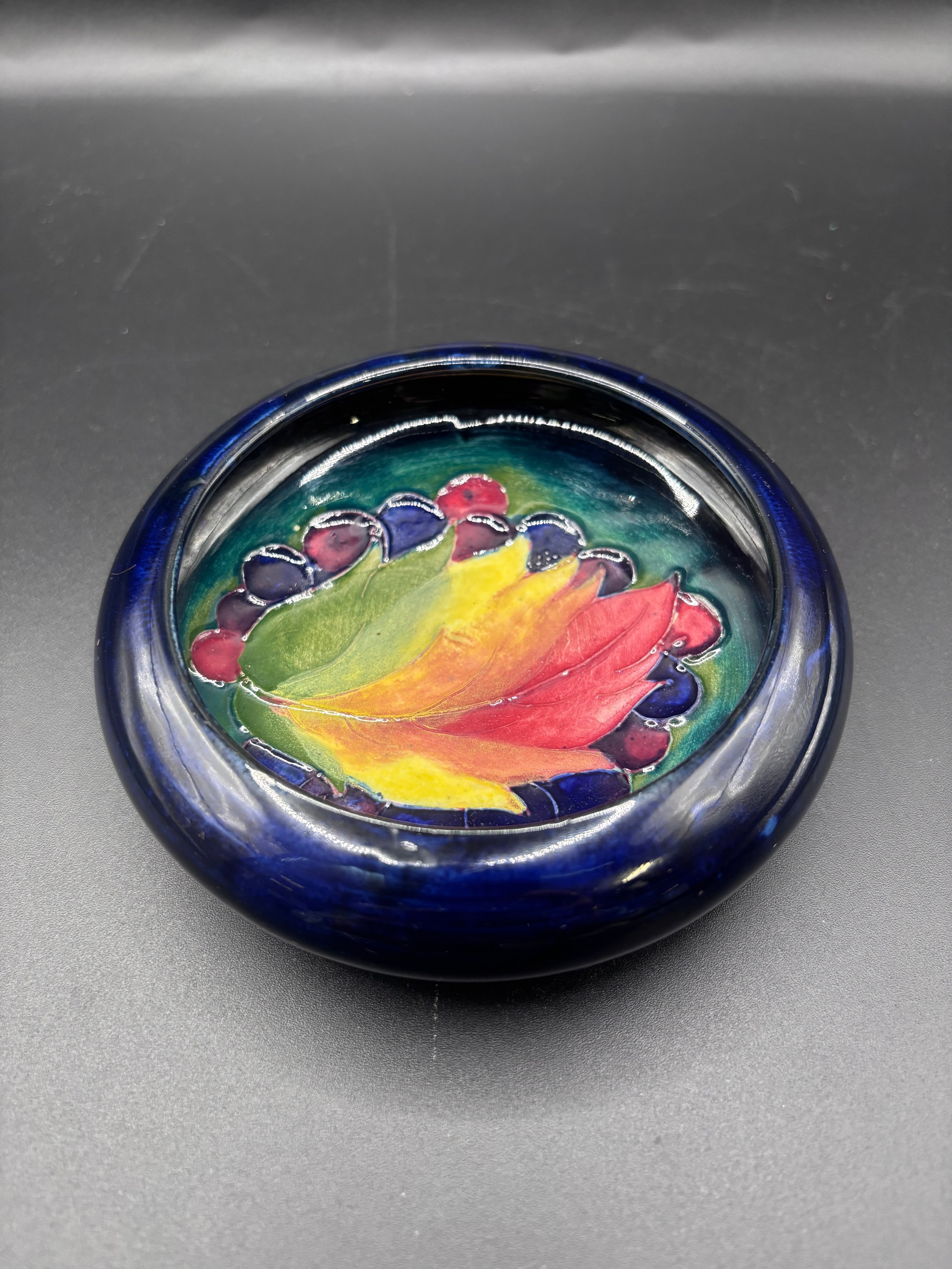 Vintage William Moorcroft ‘Leaf & Berry’ pattern pin dish. 12cm diameter. Dated between 1928 - 1945