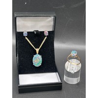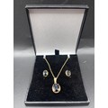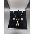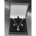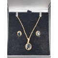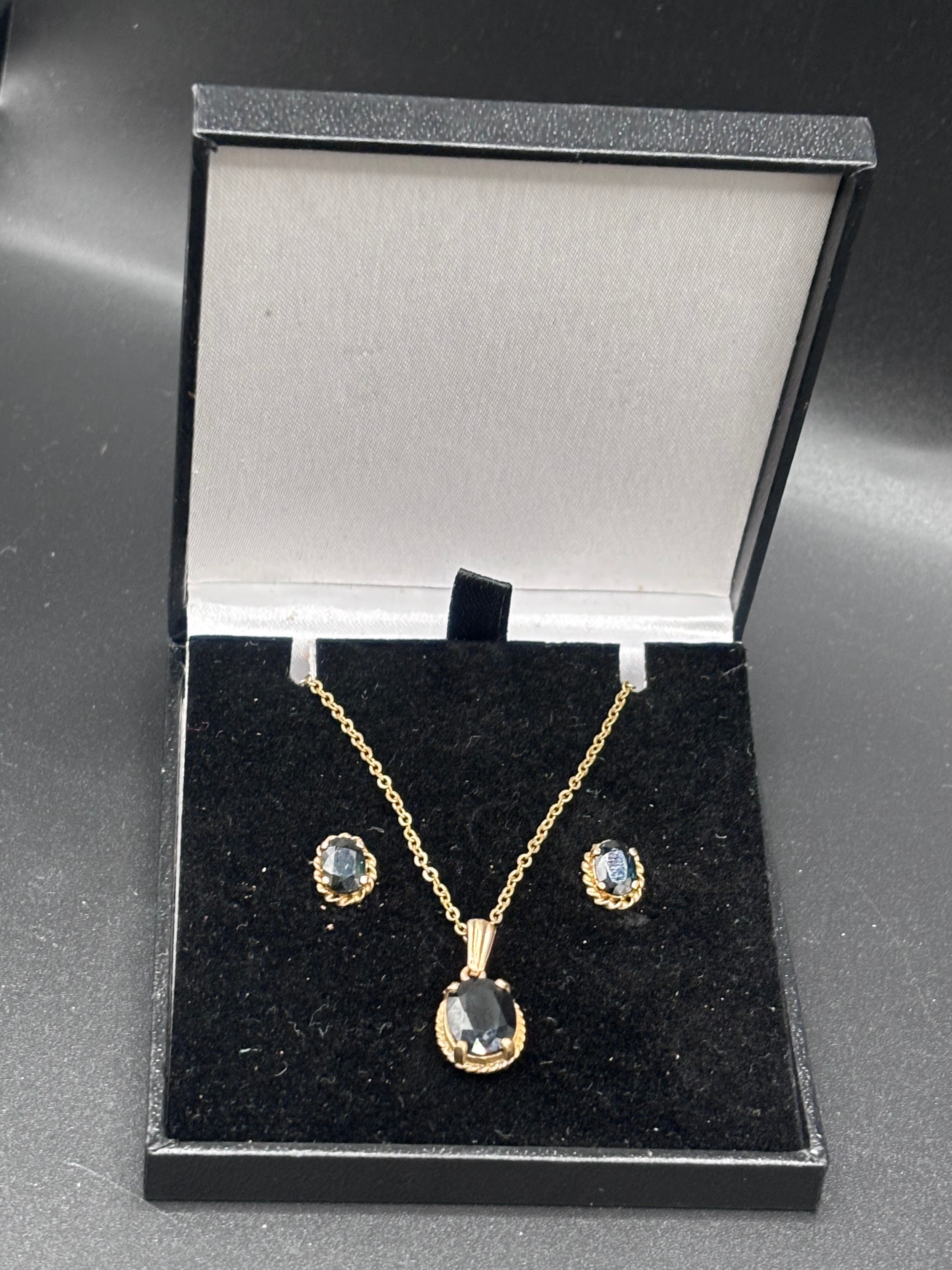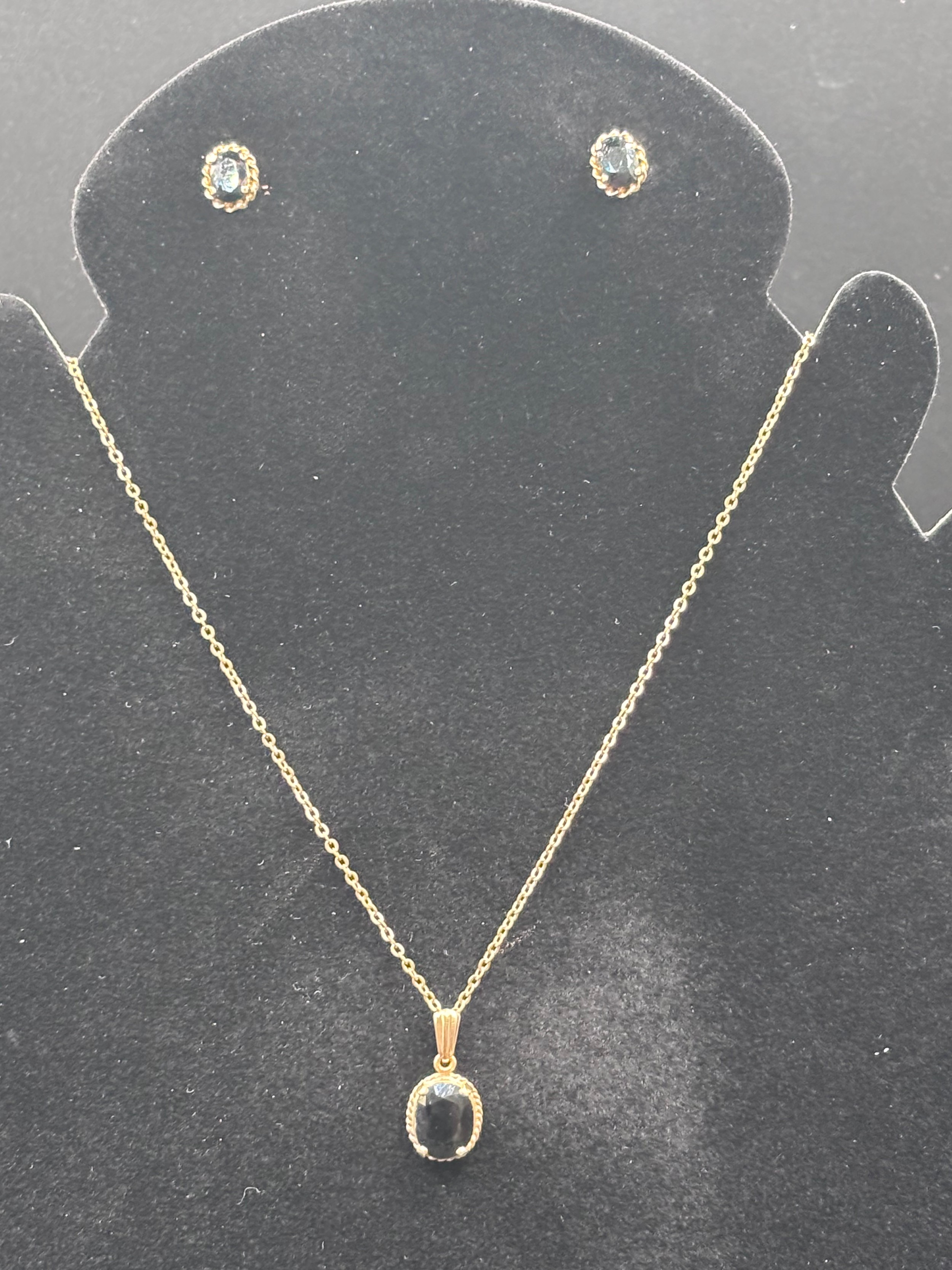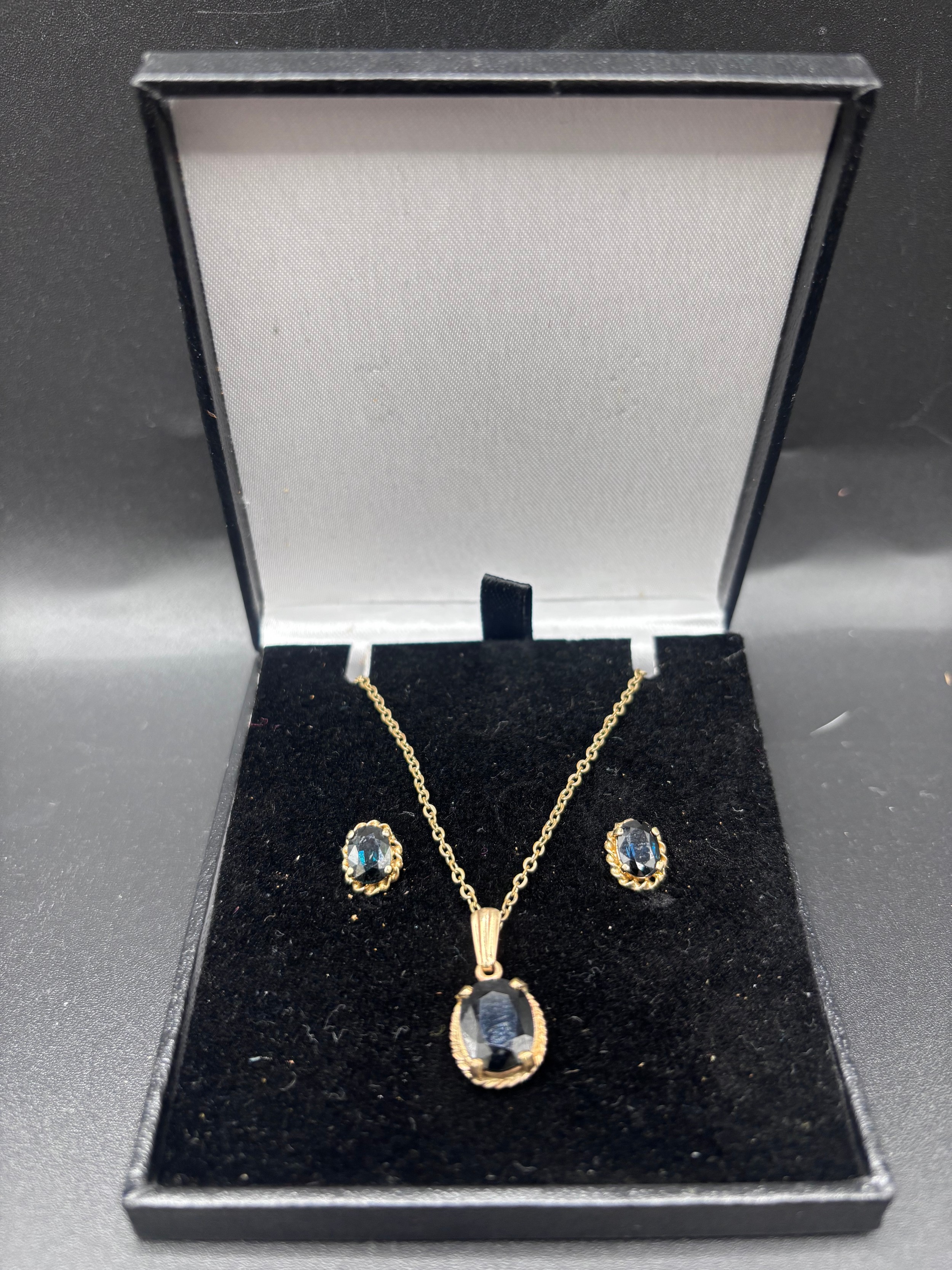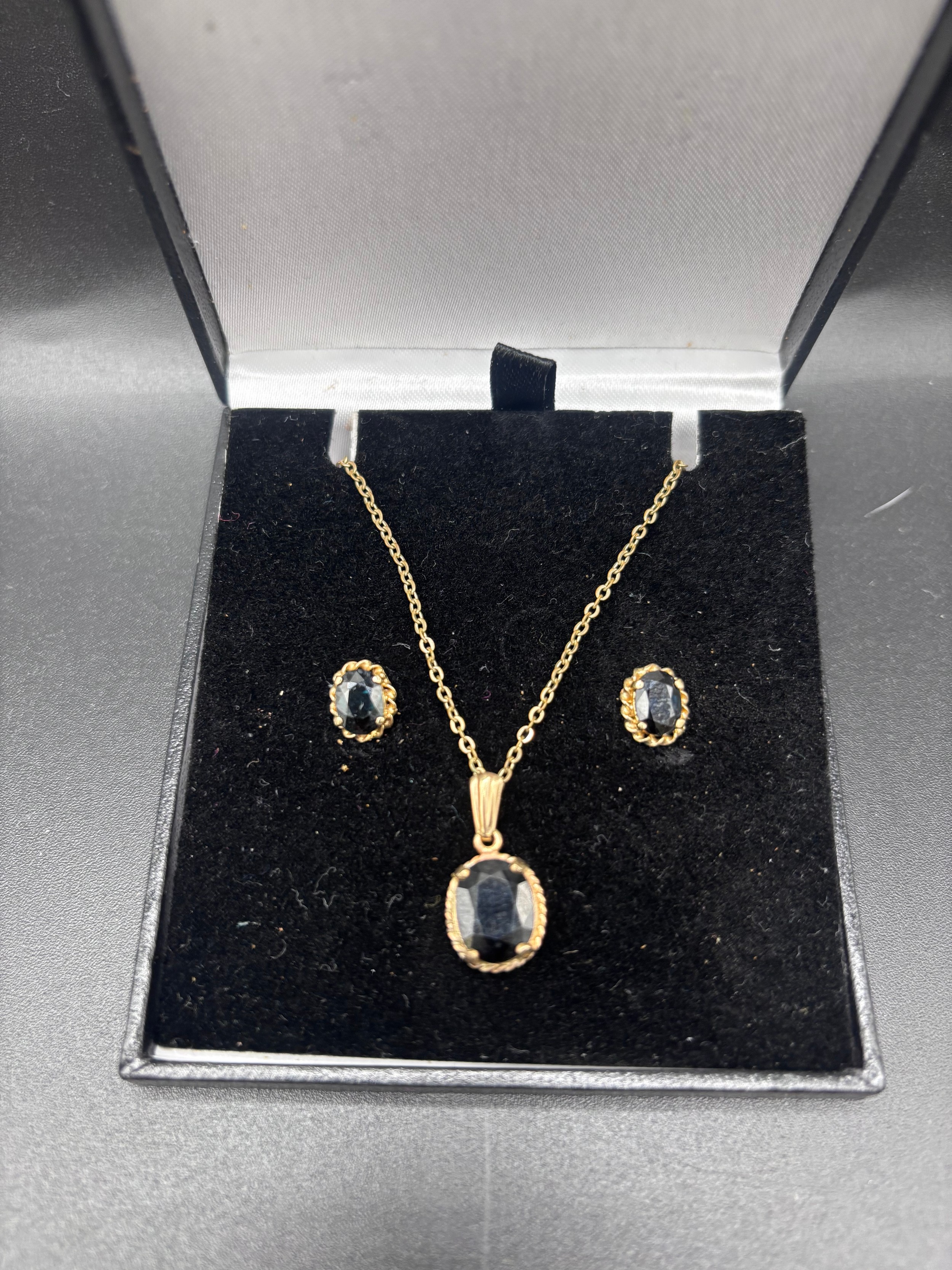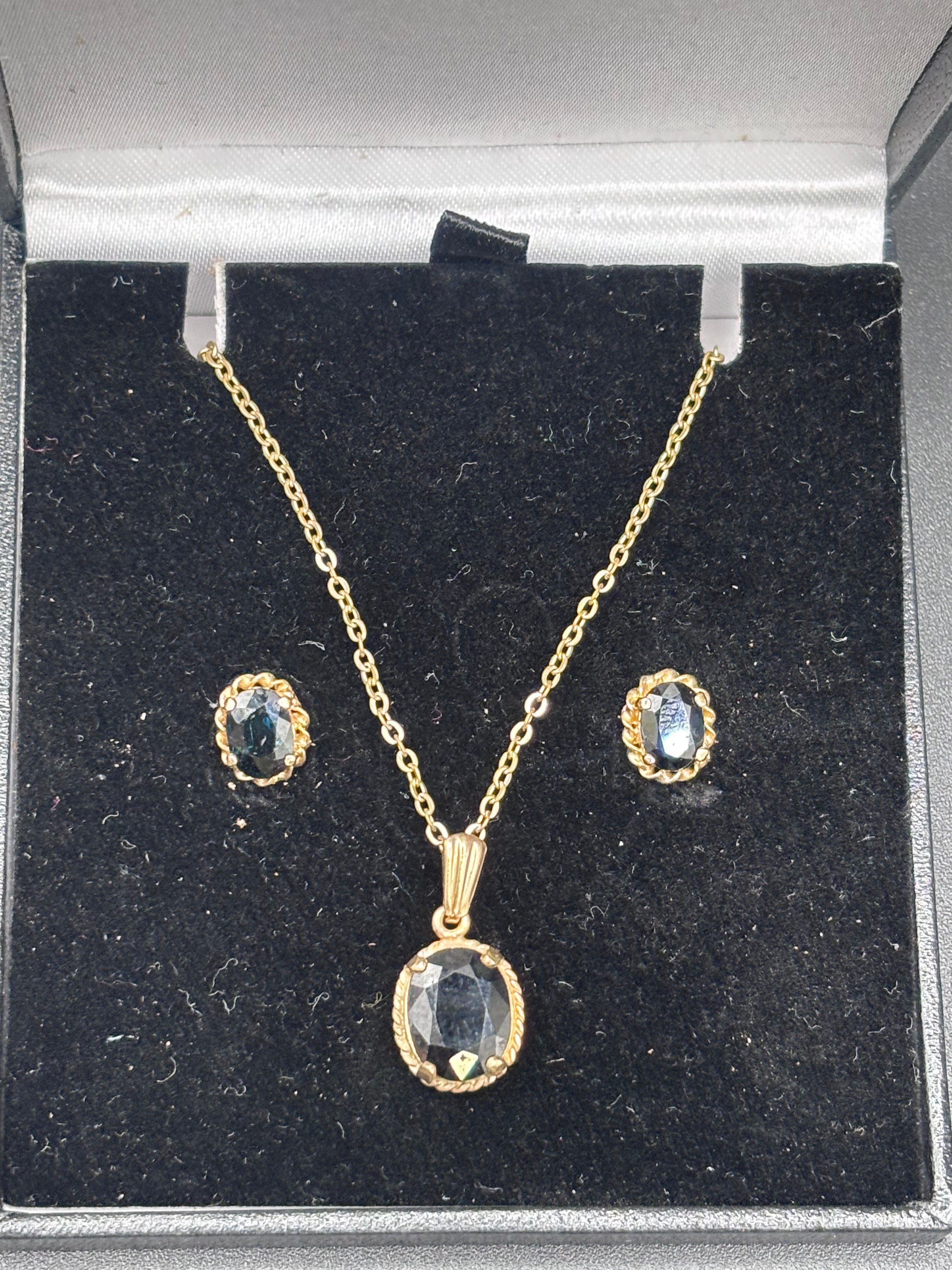 Sapphire necklace and earrings set. Total weight 4.55g. Yellow gold colour but no visible hallmark