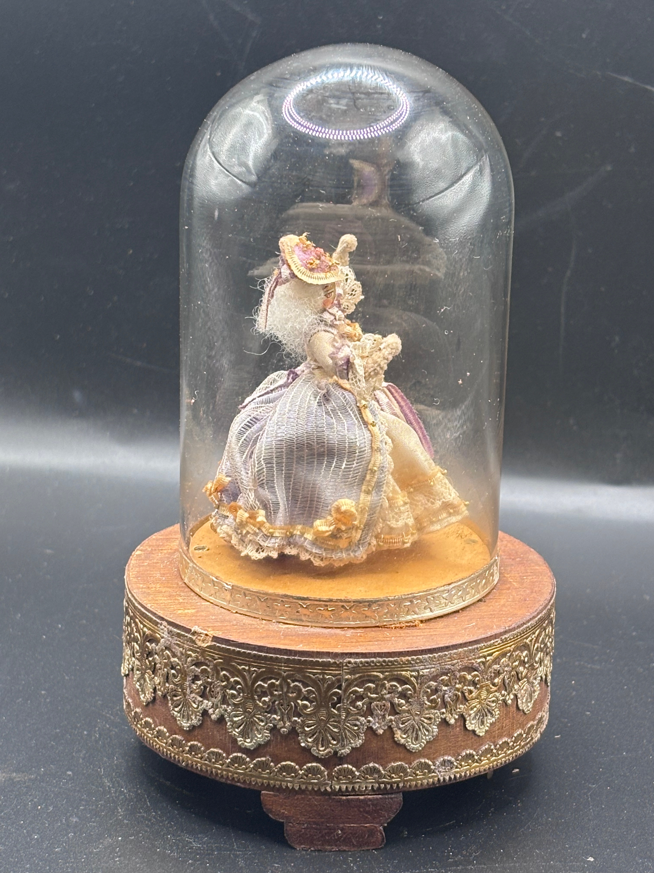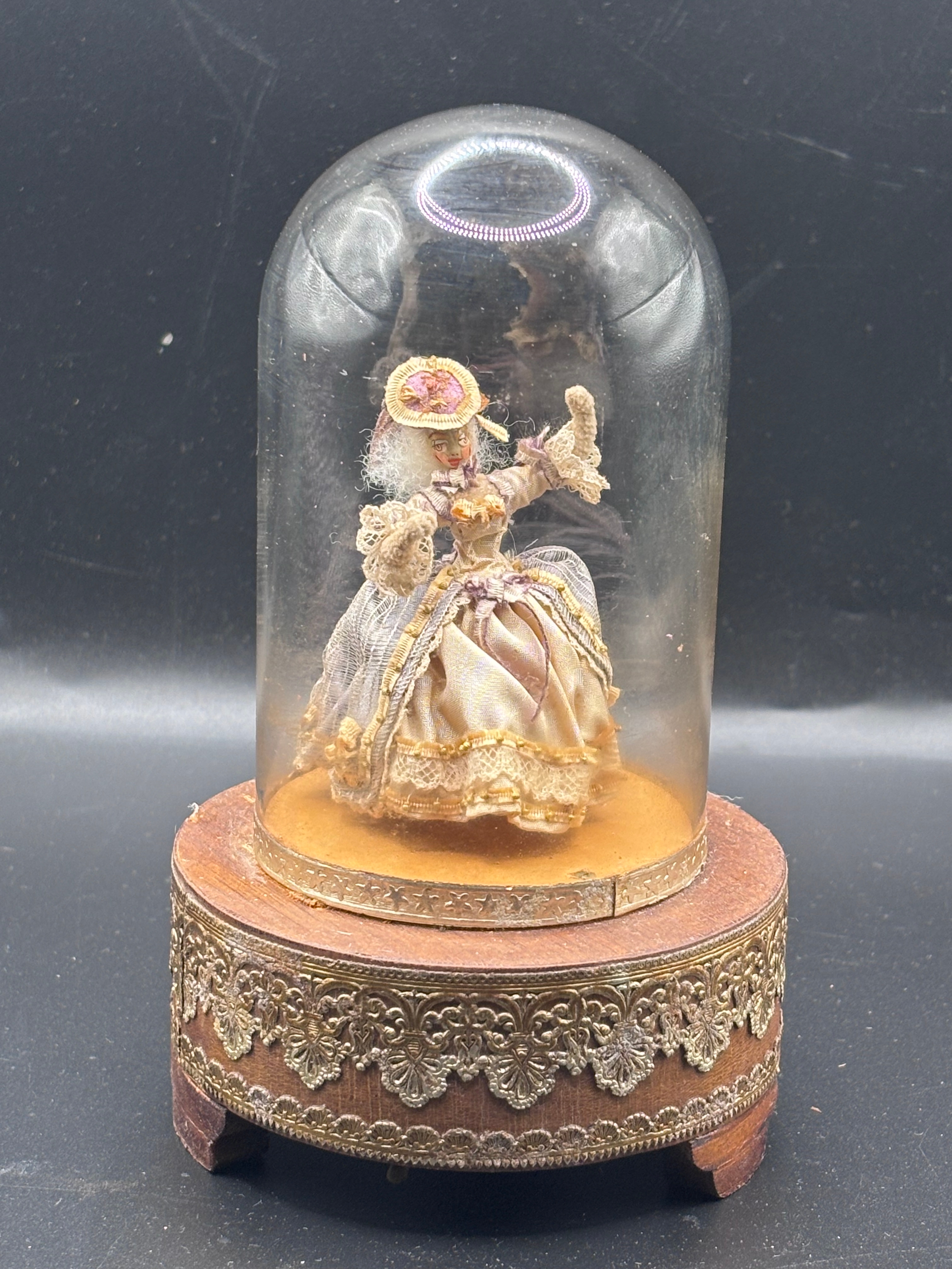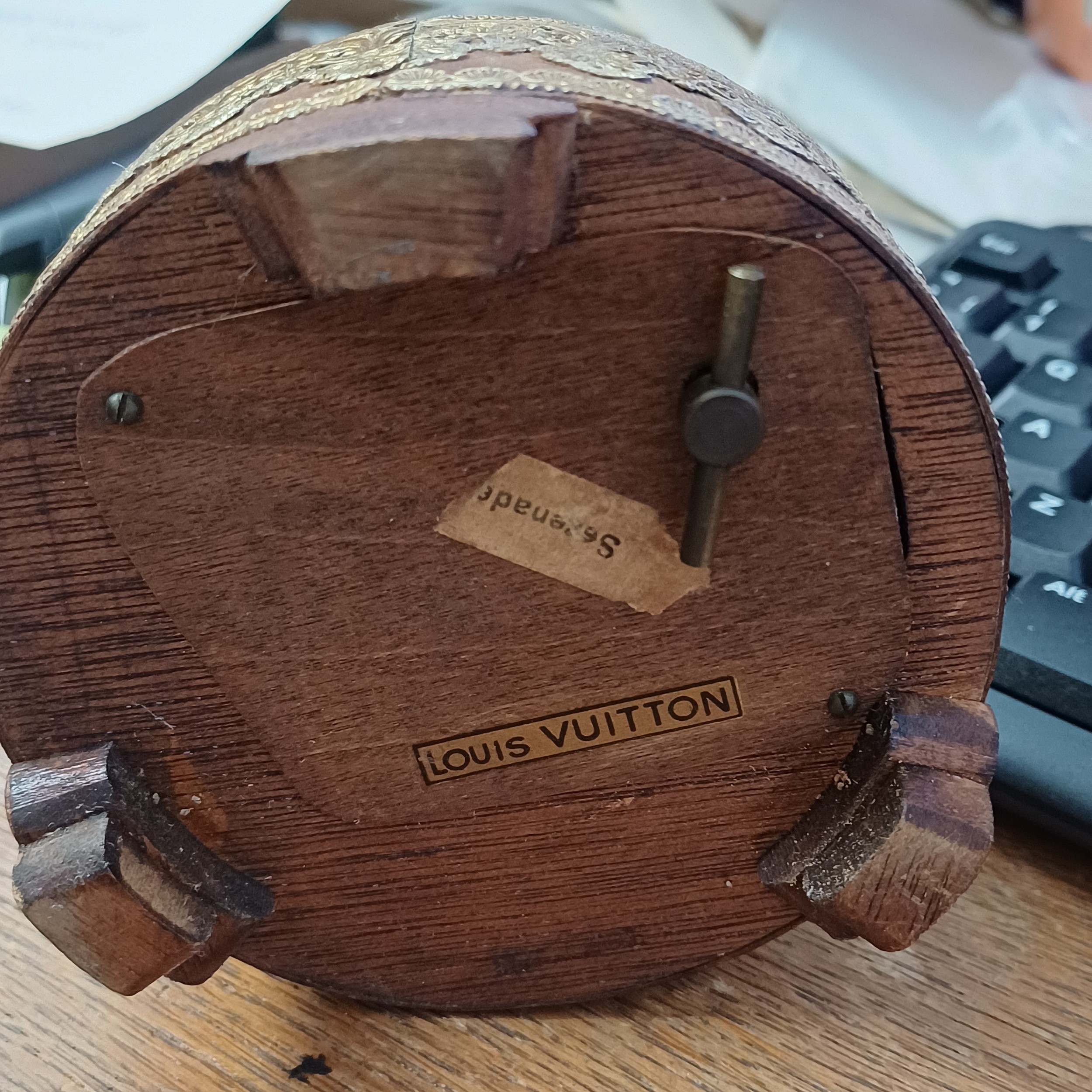 Louis Vuitton. This vintage music box automaton features a miniature doll under a glass dome and is made by Louis Vutton and is a rare find.