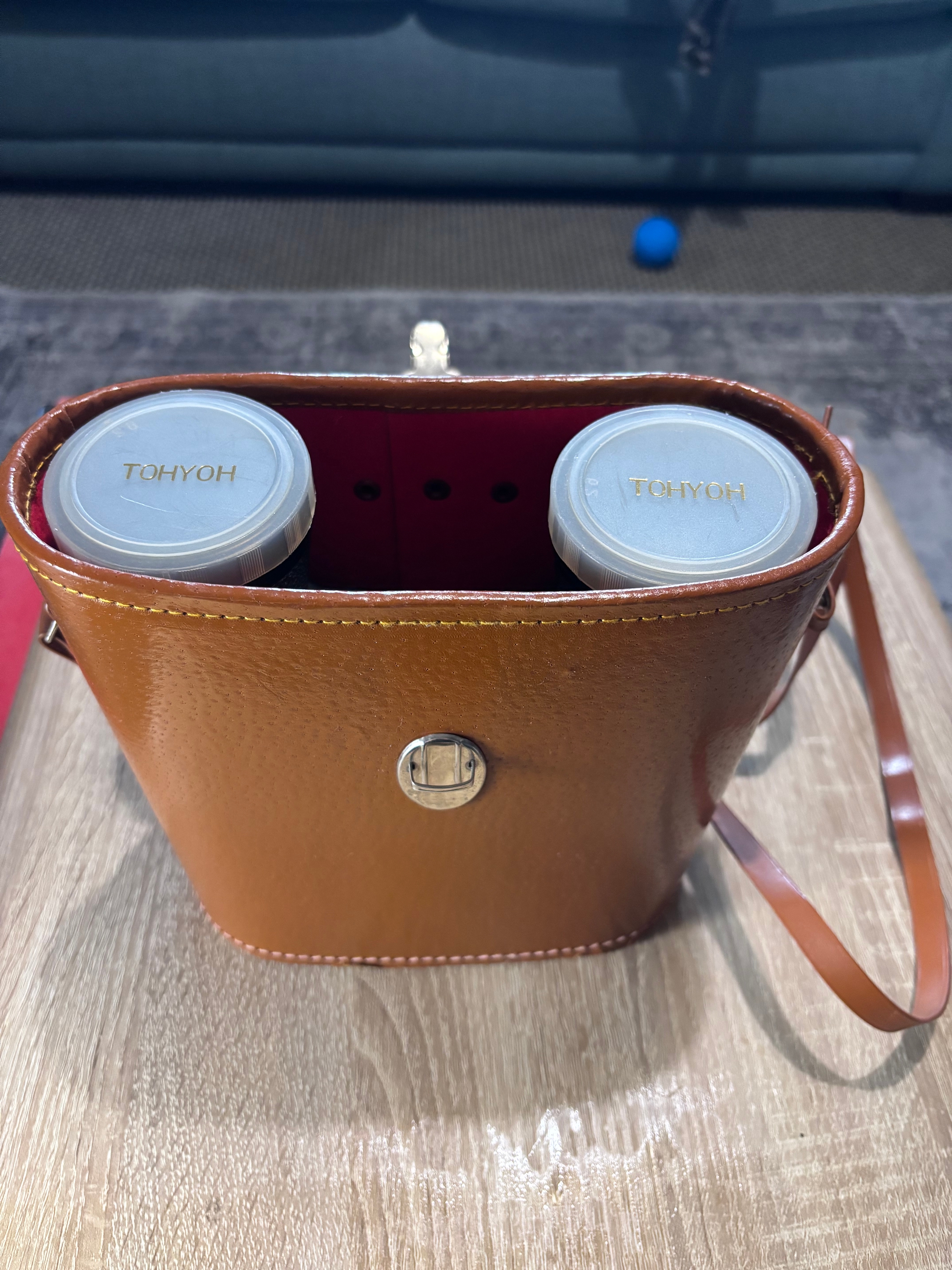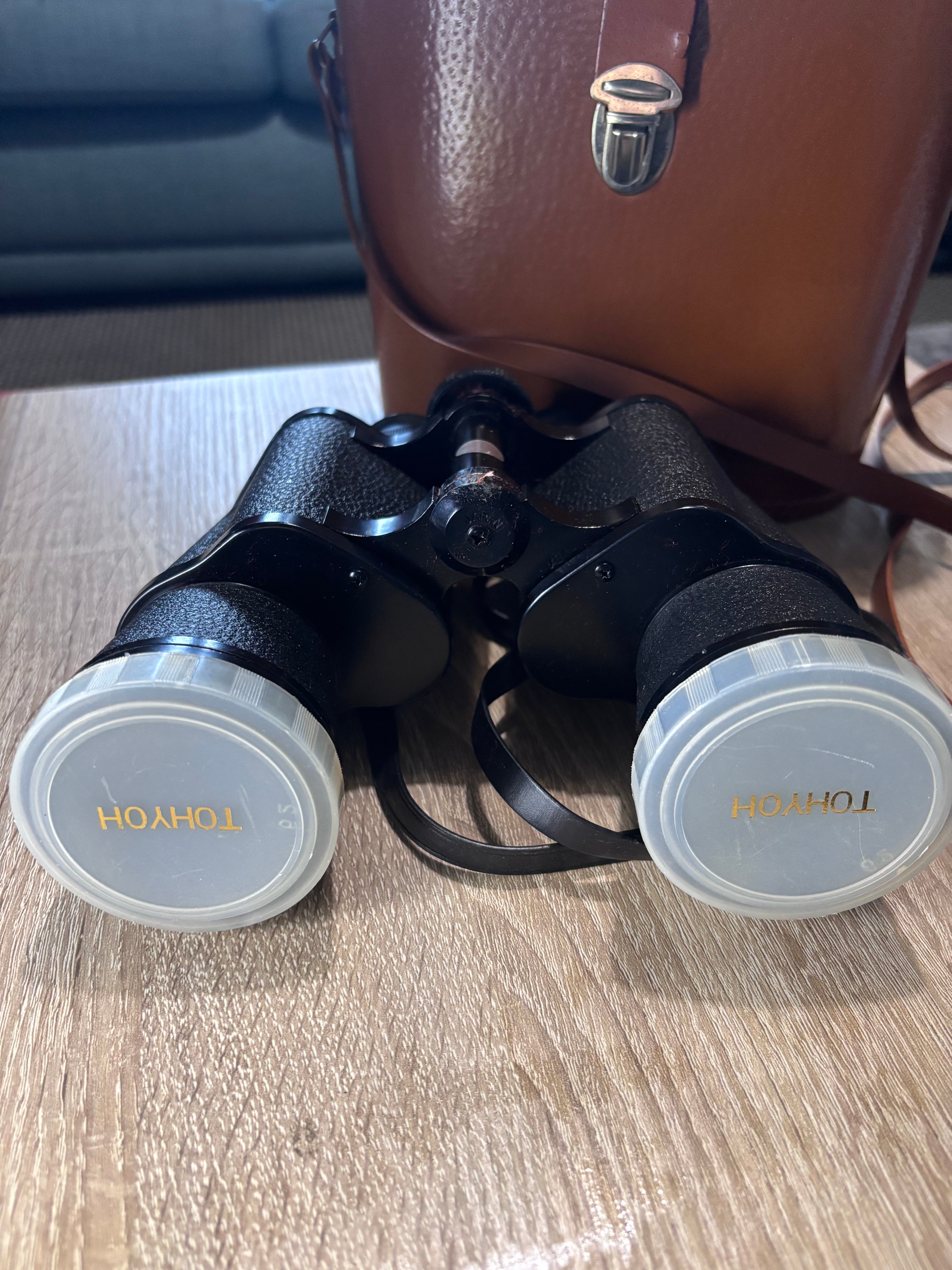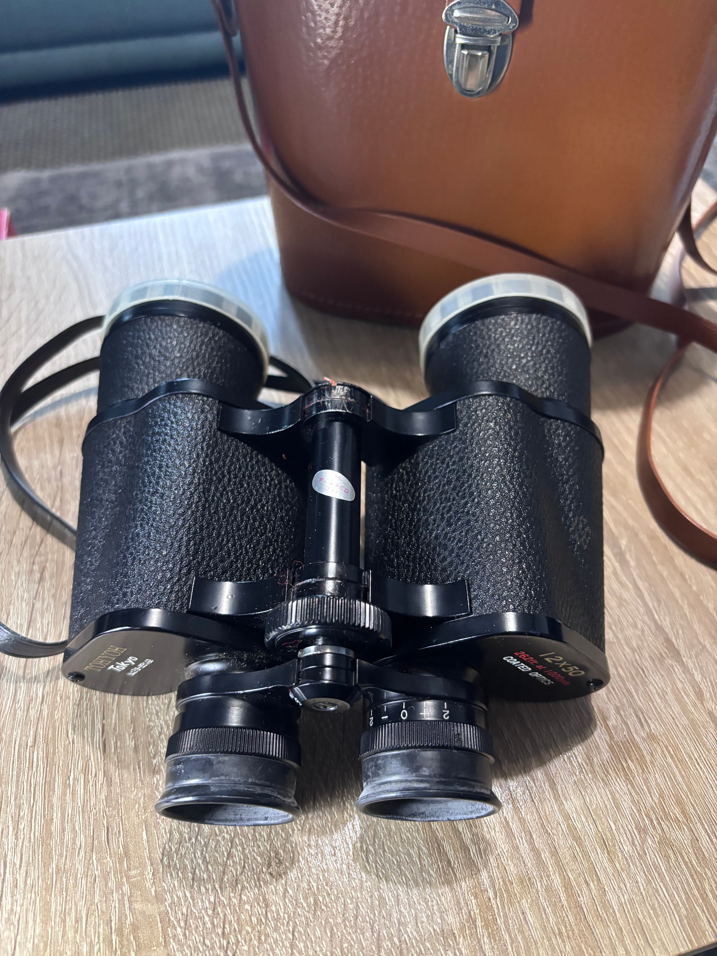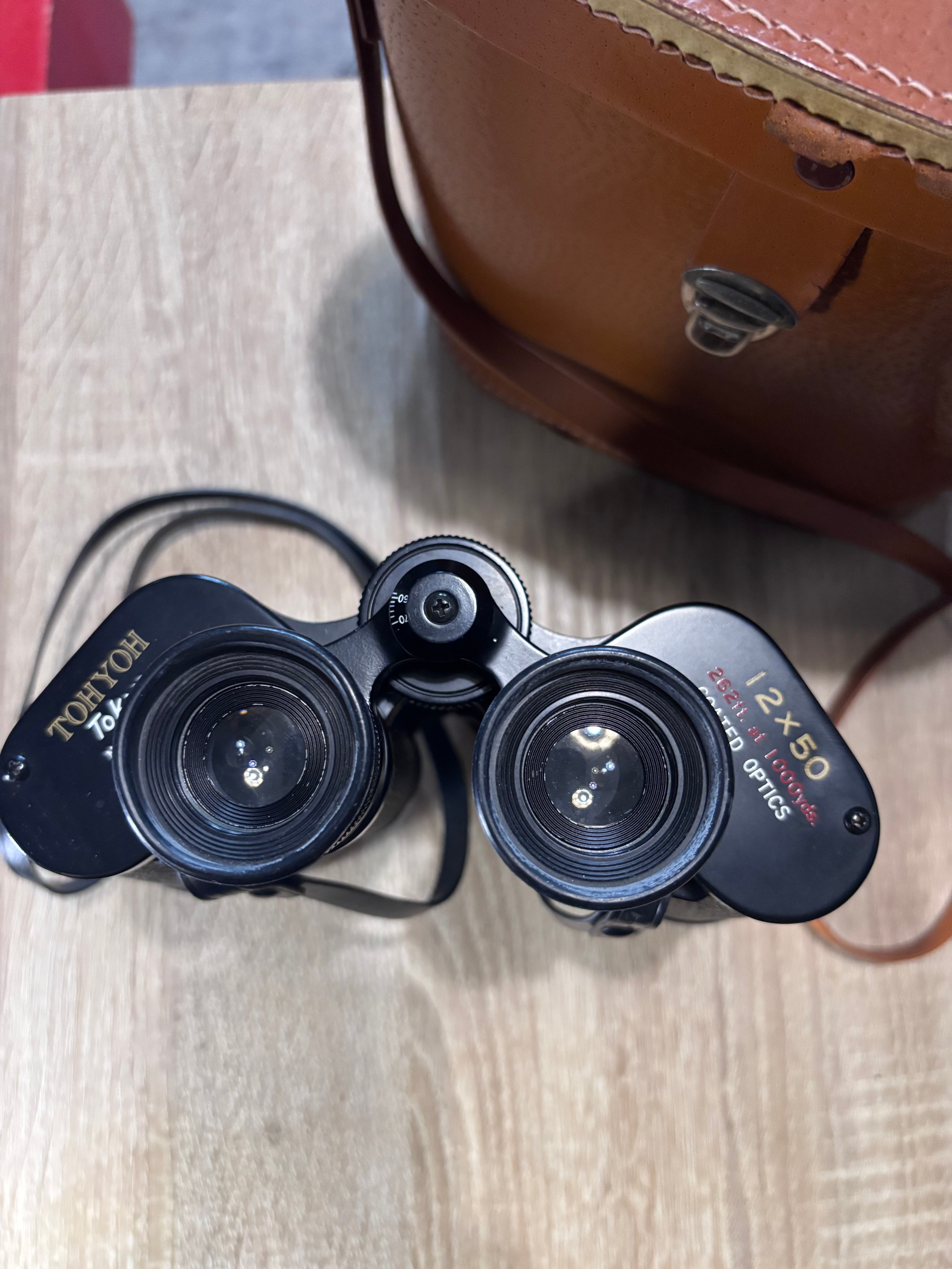 This item is a pair of vintage Hyoh Tokyo 12x50 binoculars, featuring coated optics and a field of view of 262 feet at 1000 yards.