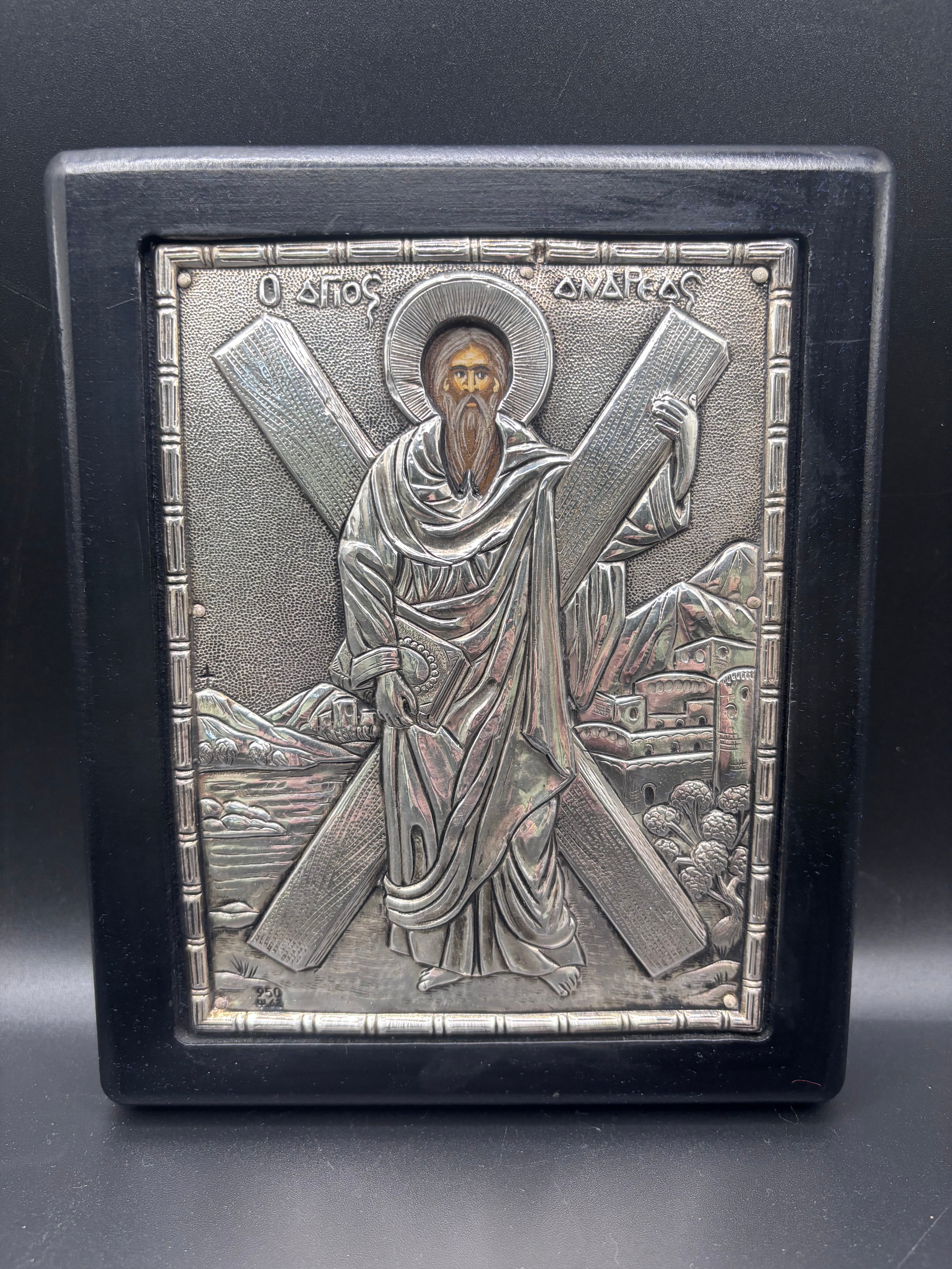 This is a Byzantine silver icon of Saint Andreas (Andrew the Apostle).