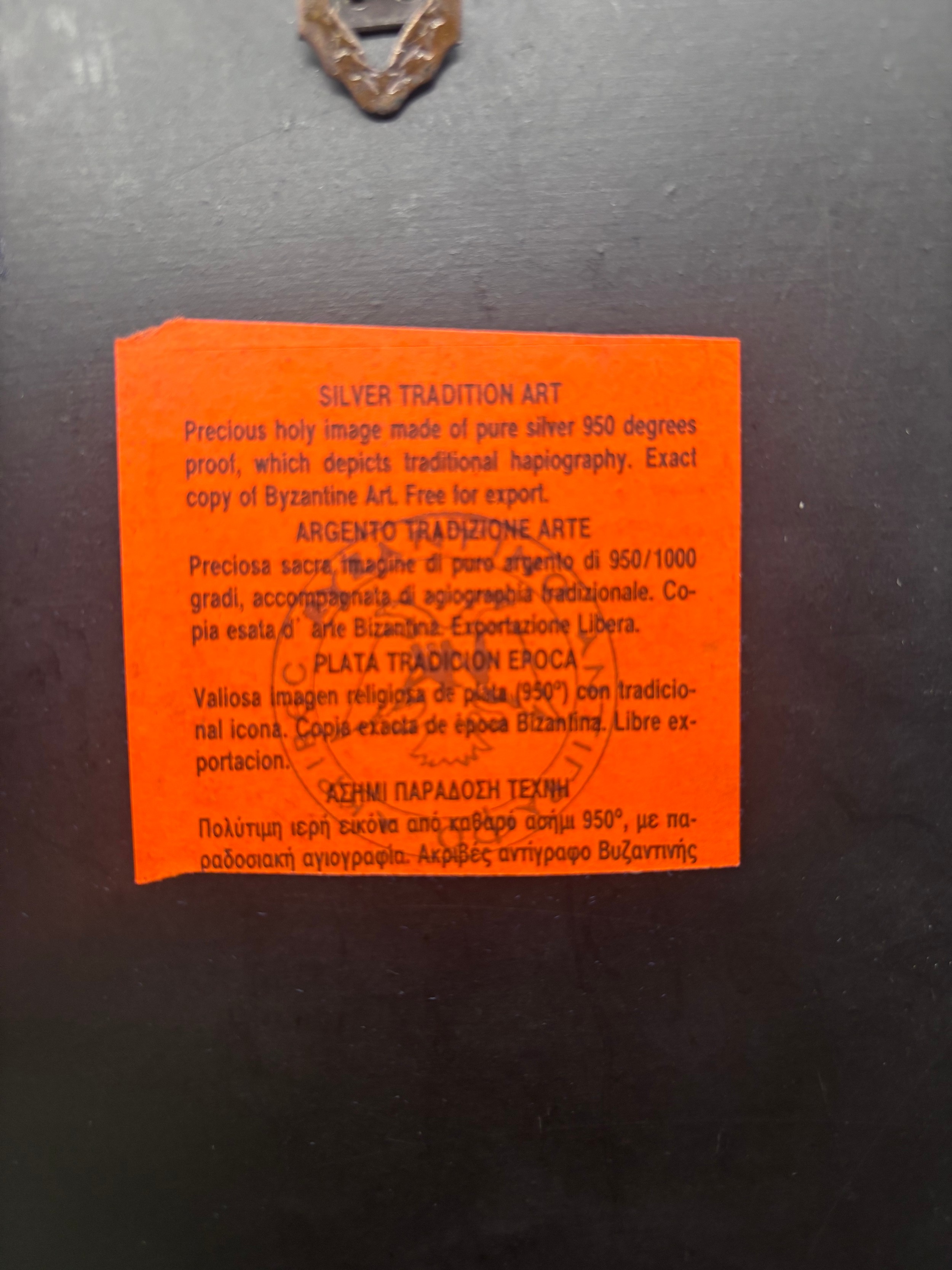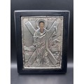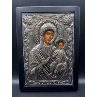 The icon is handmade in Greece and features a 925 sterling silver image mounted on a black wooden frame