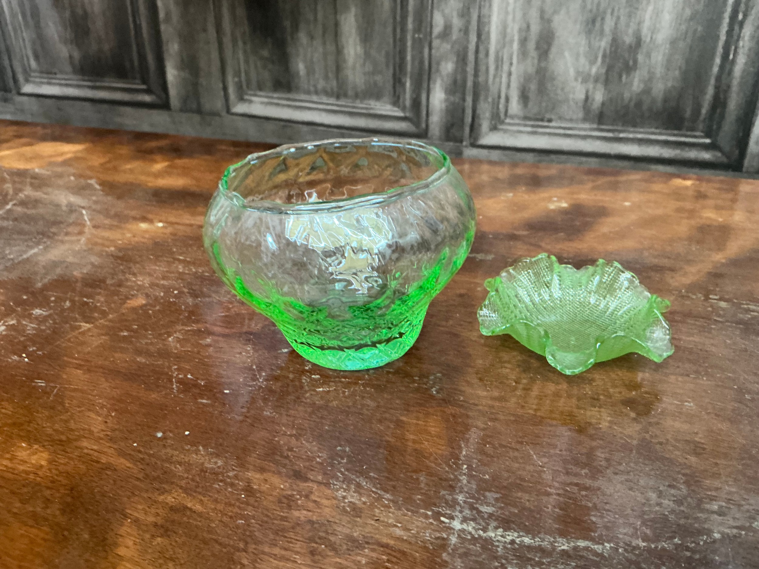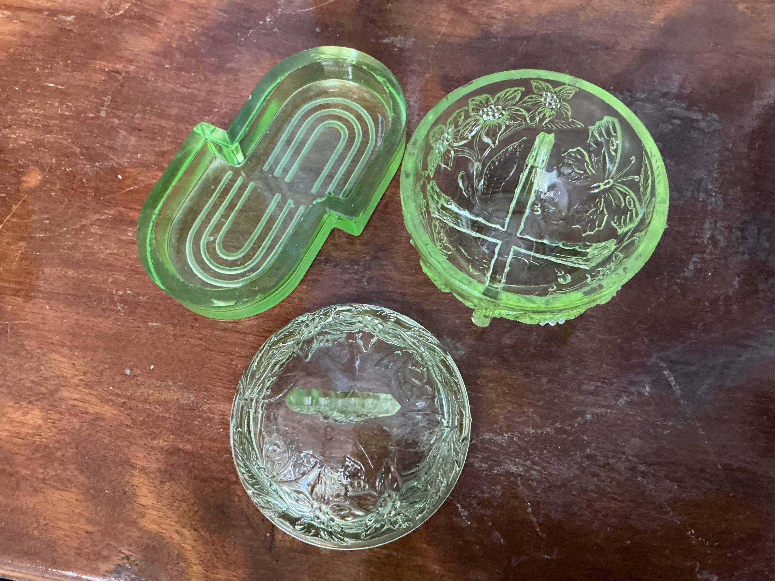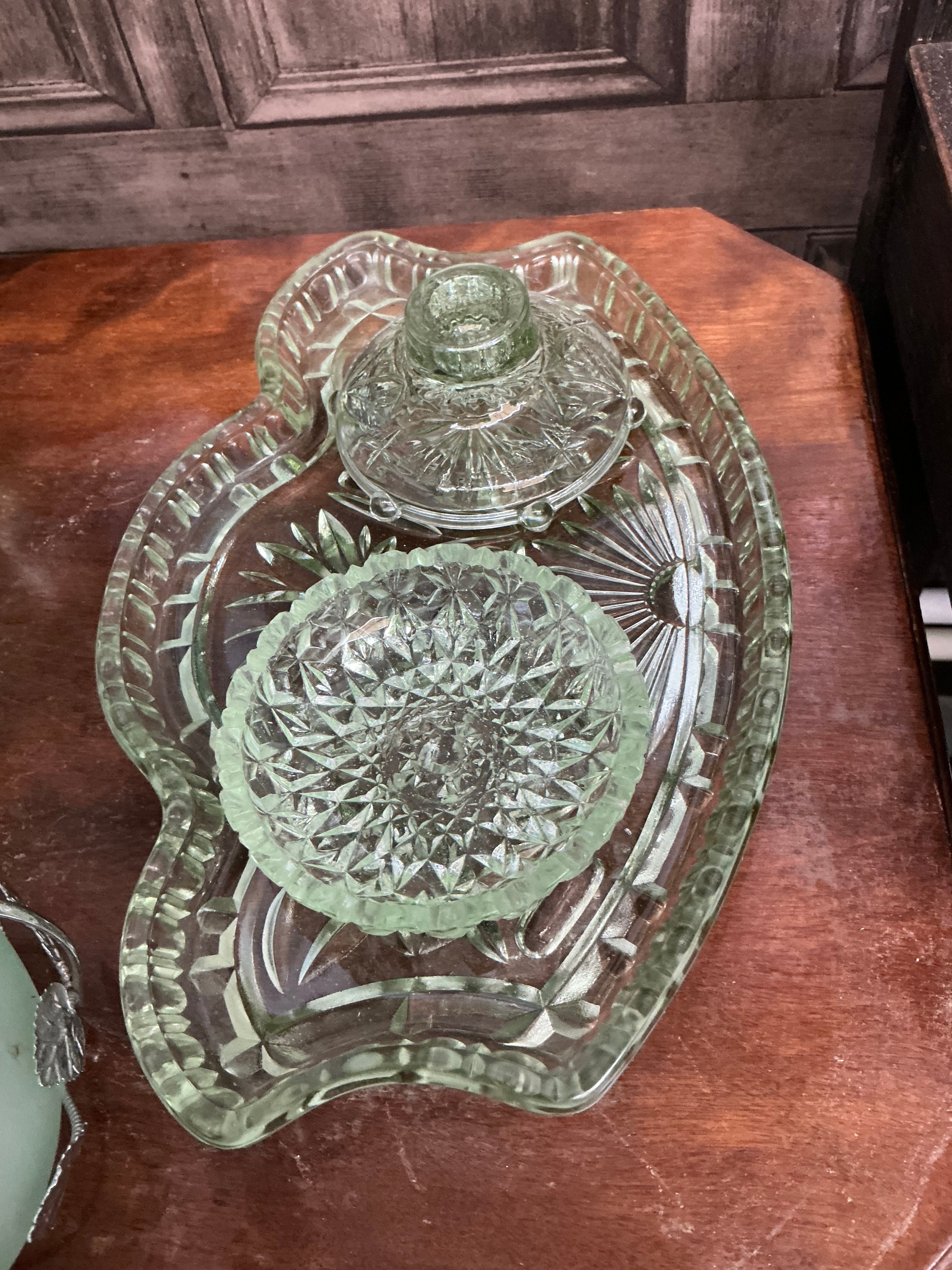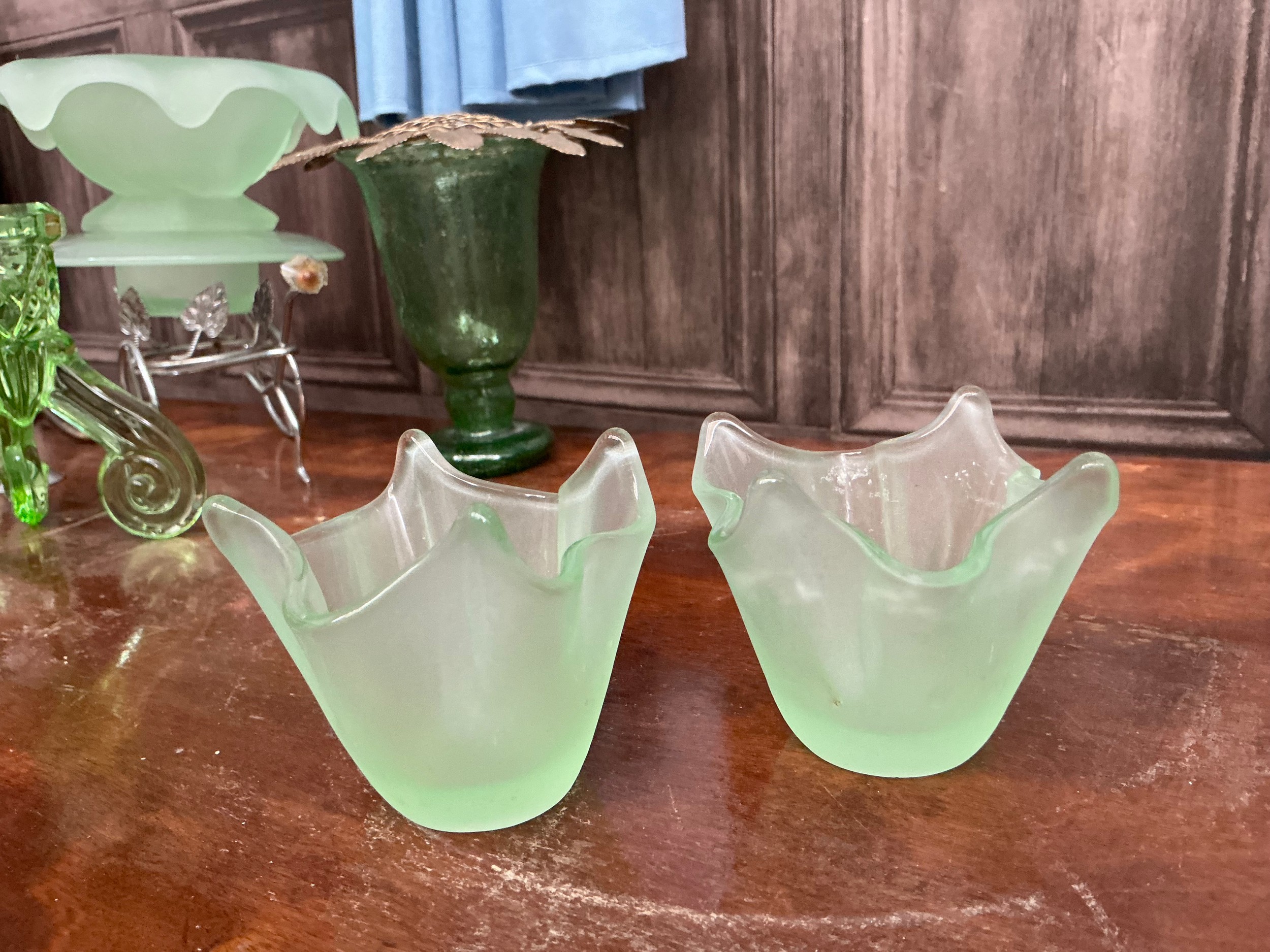 Selection of green glass items, some confirmed as Uranium glass, really pretty collection