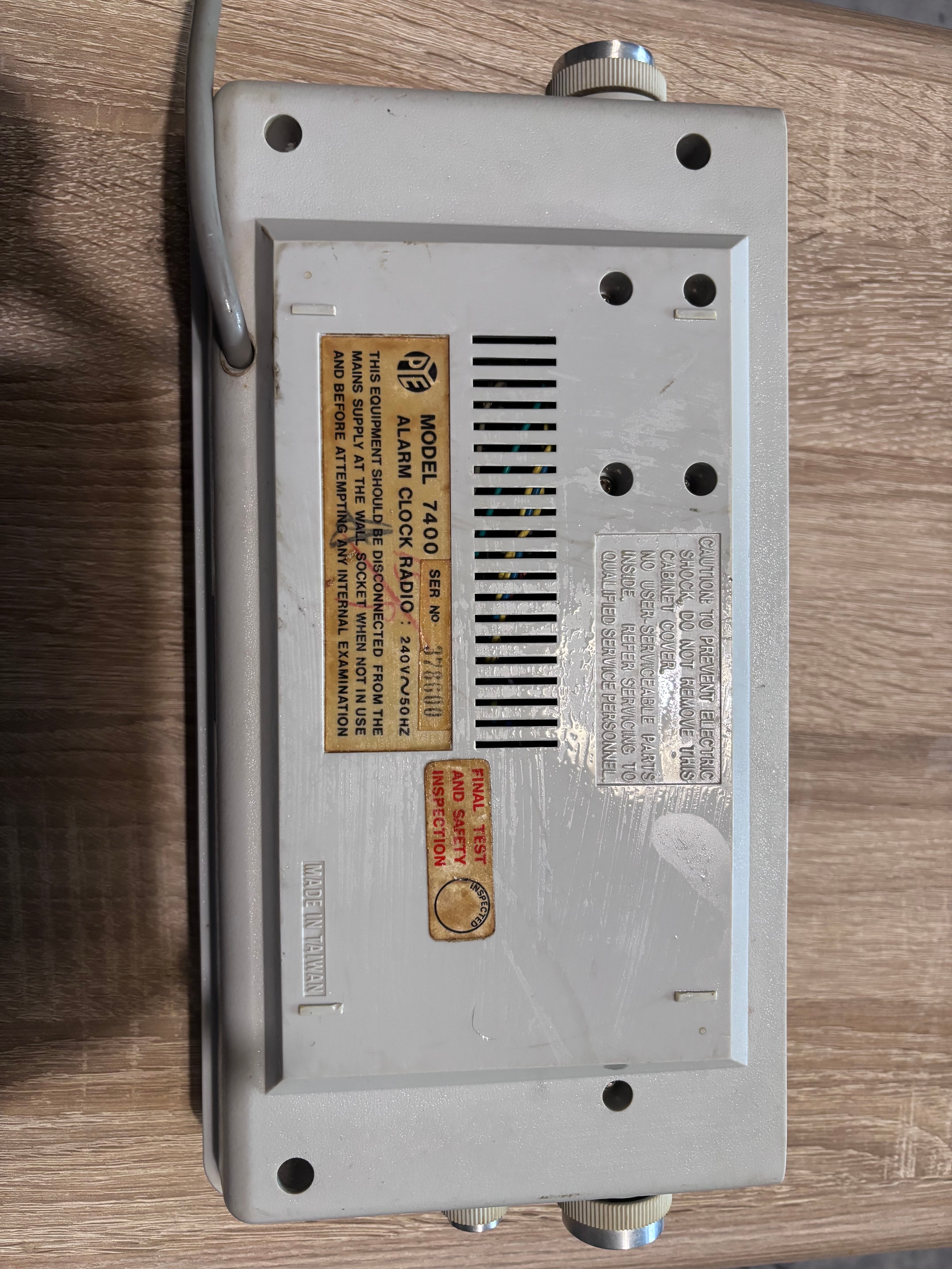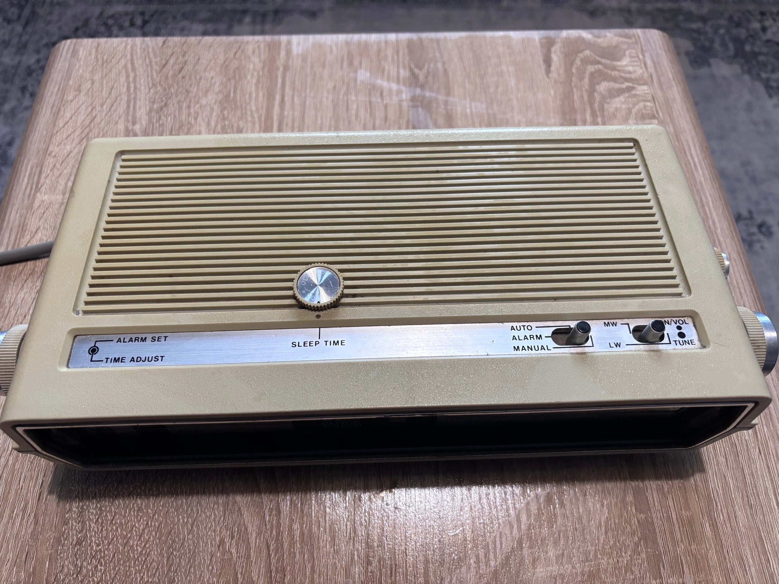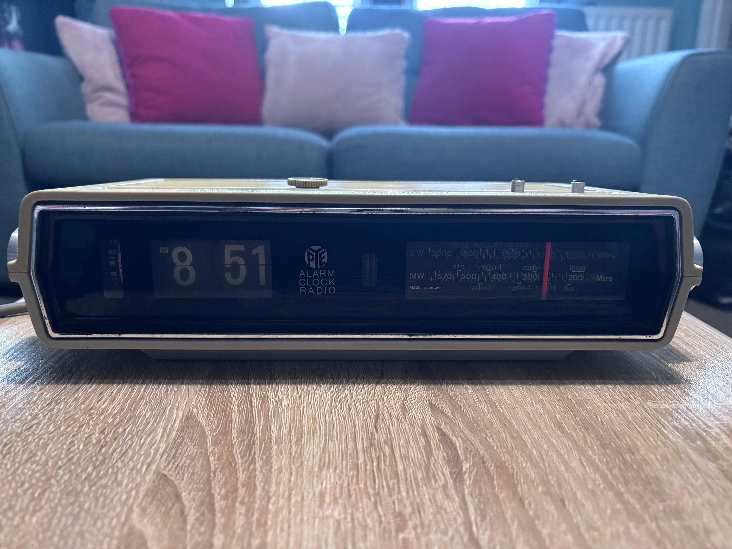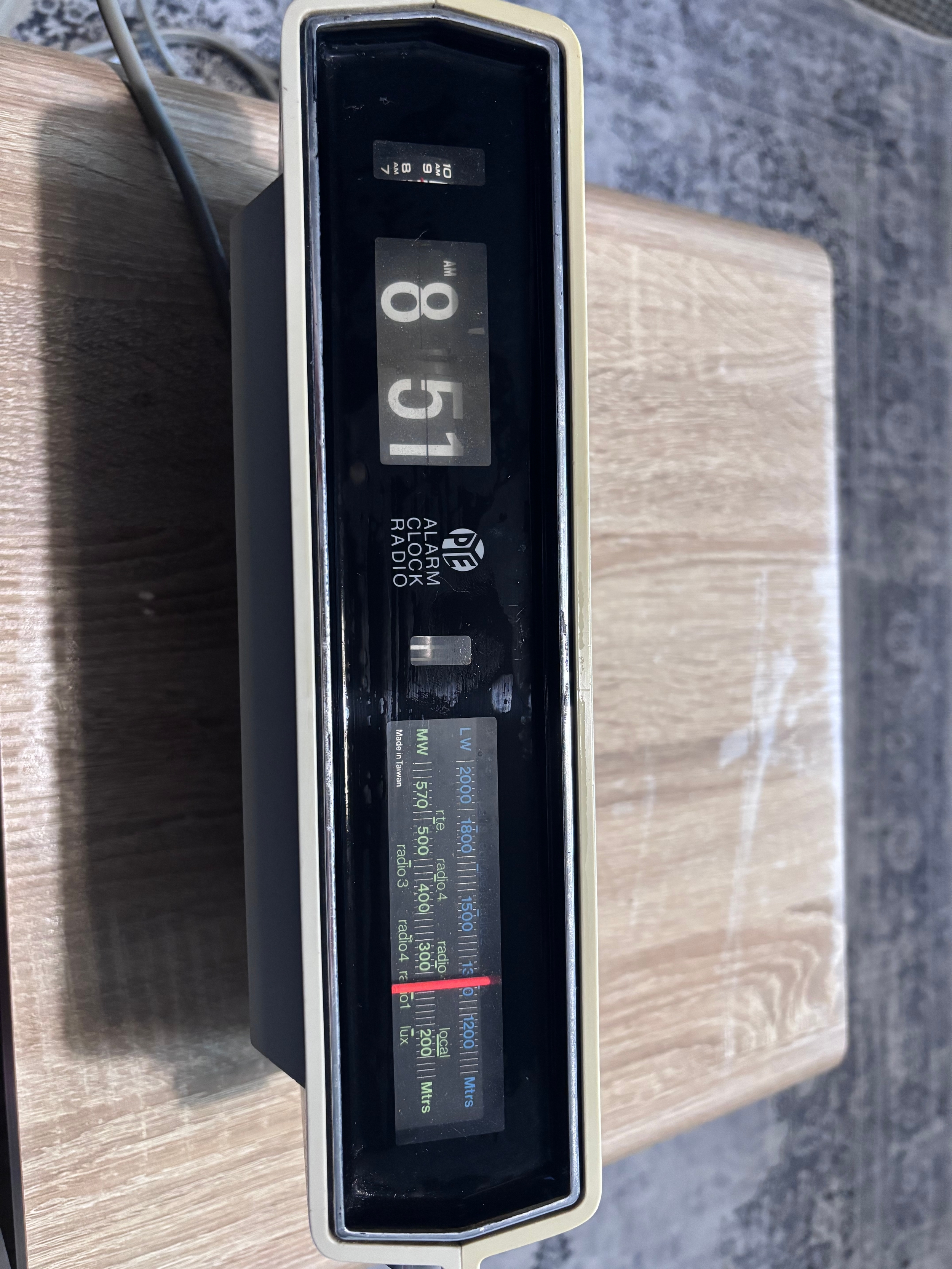 This is a vintage Pye MW570 flip clock radio from the 1970s, which is a collectible item featuring a mechanical display where numbers flip over to indicate the time.