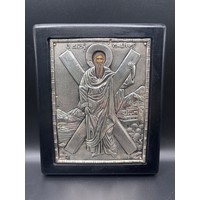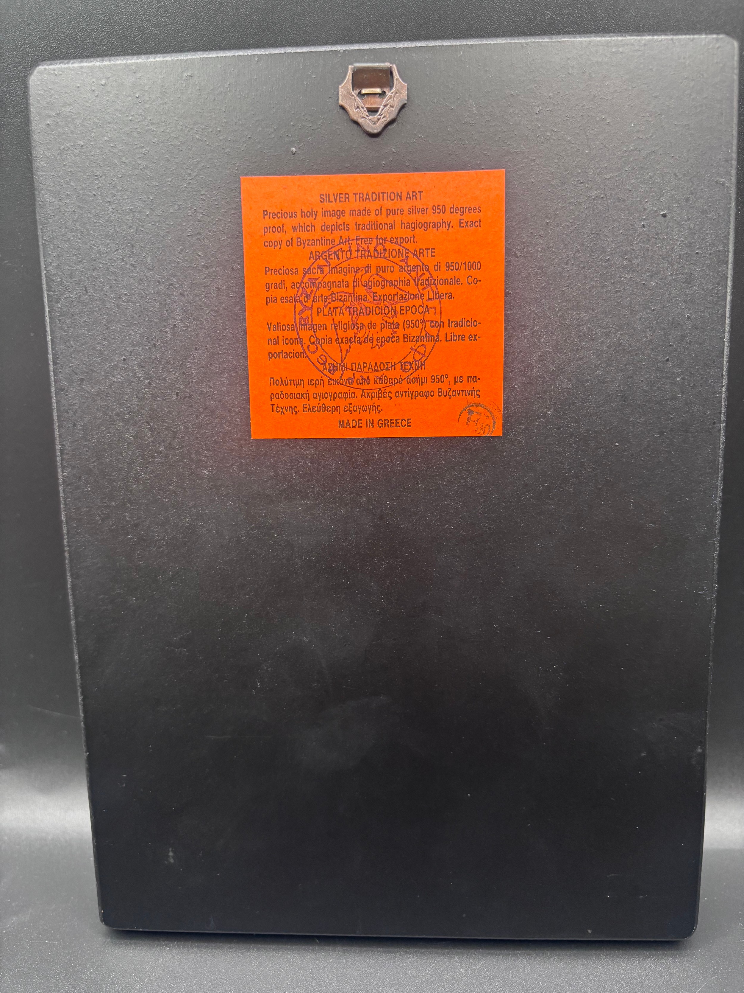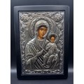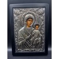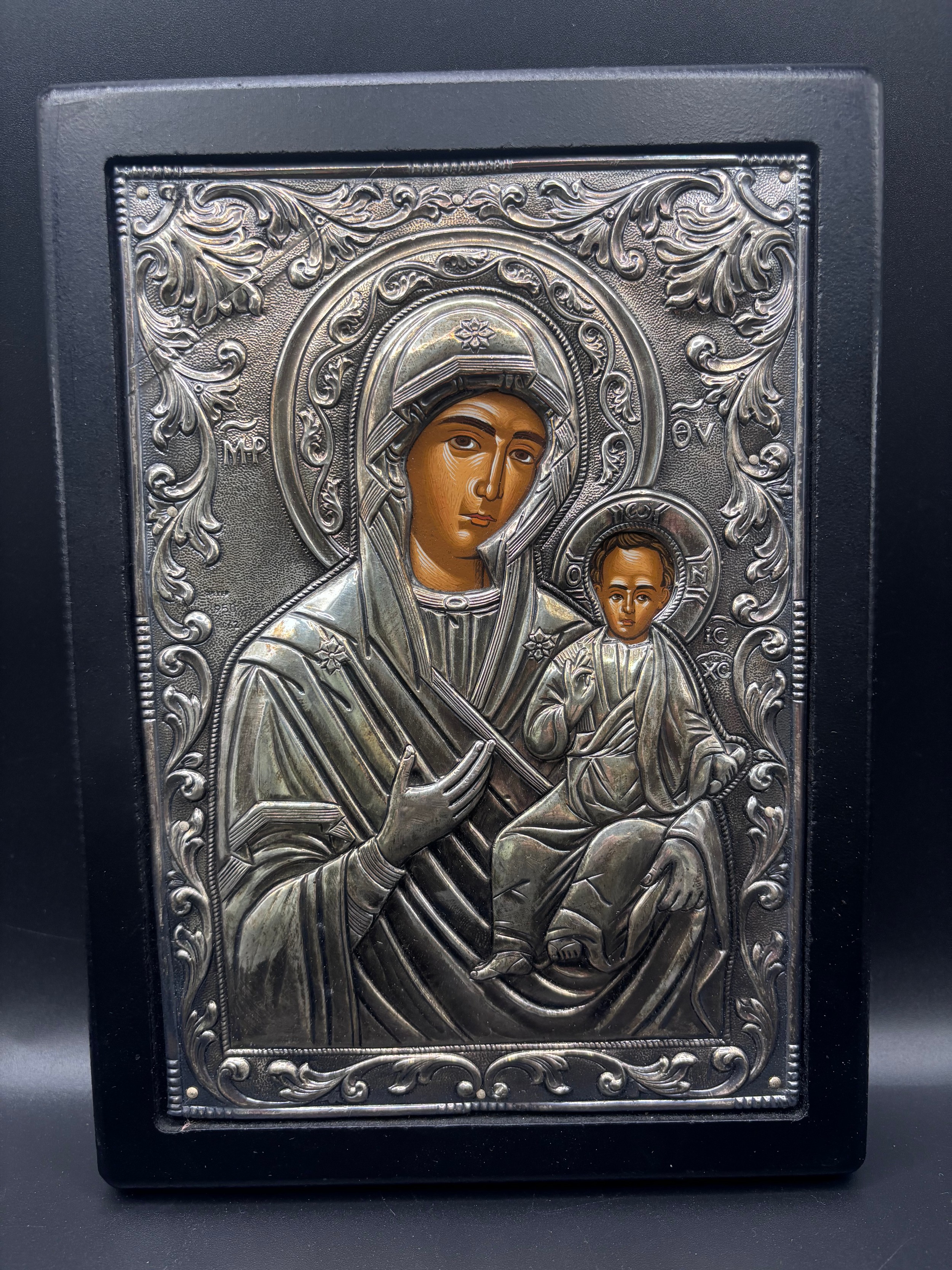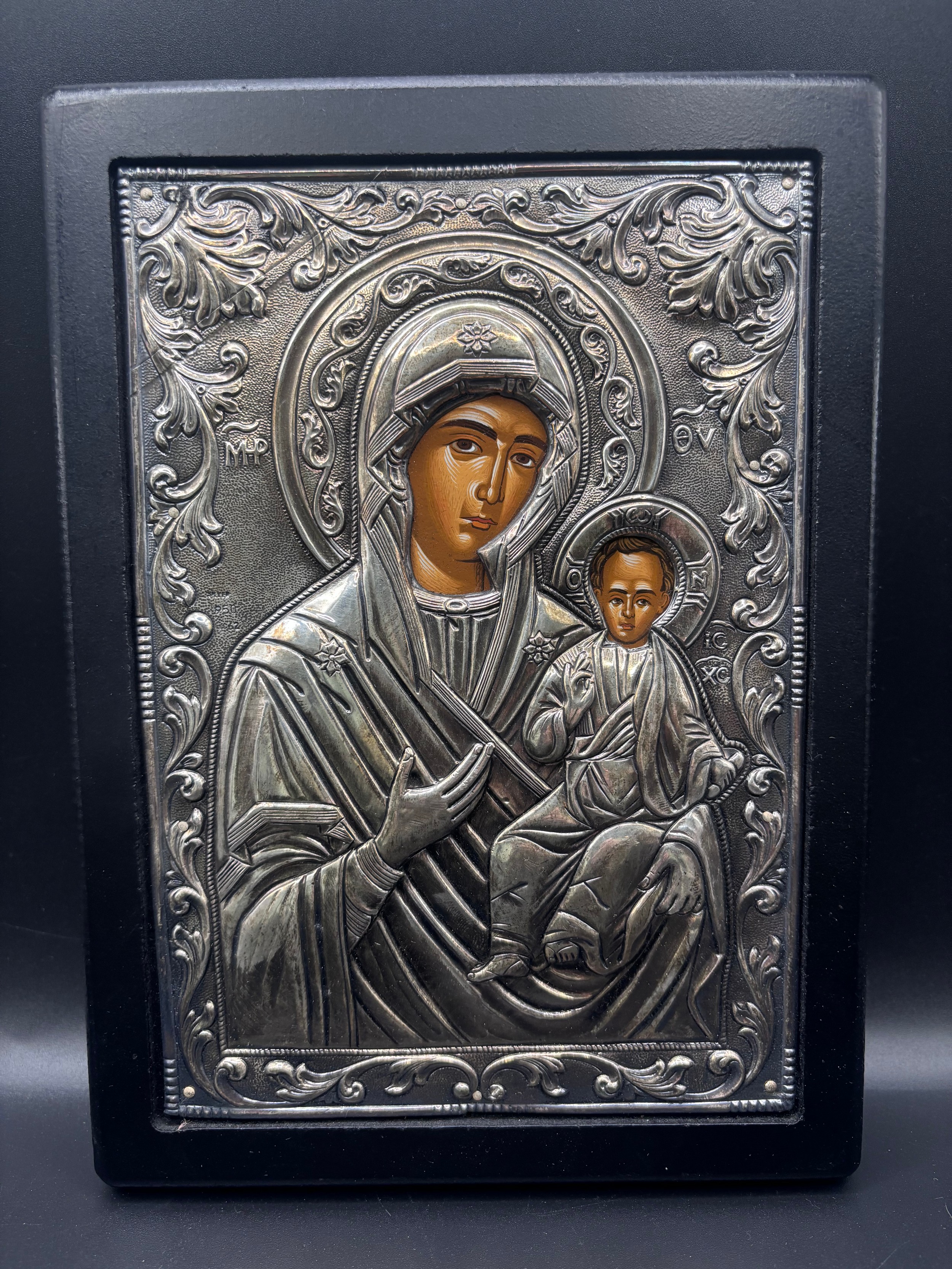 This is a Greek Orthodox icon depicting the Virgin Mary and Child, Byzantine art style in silver 925.