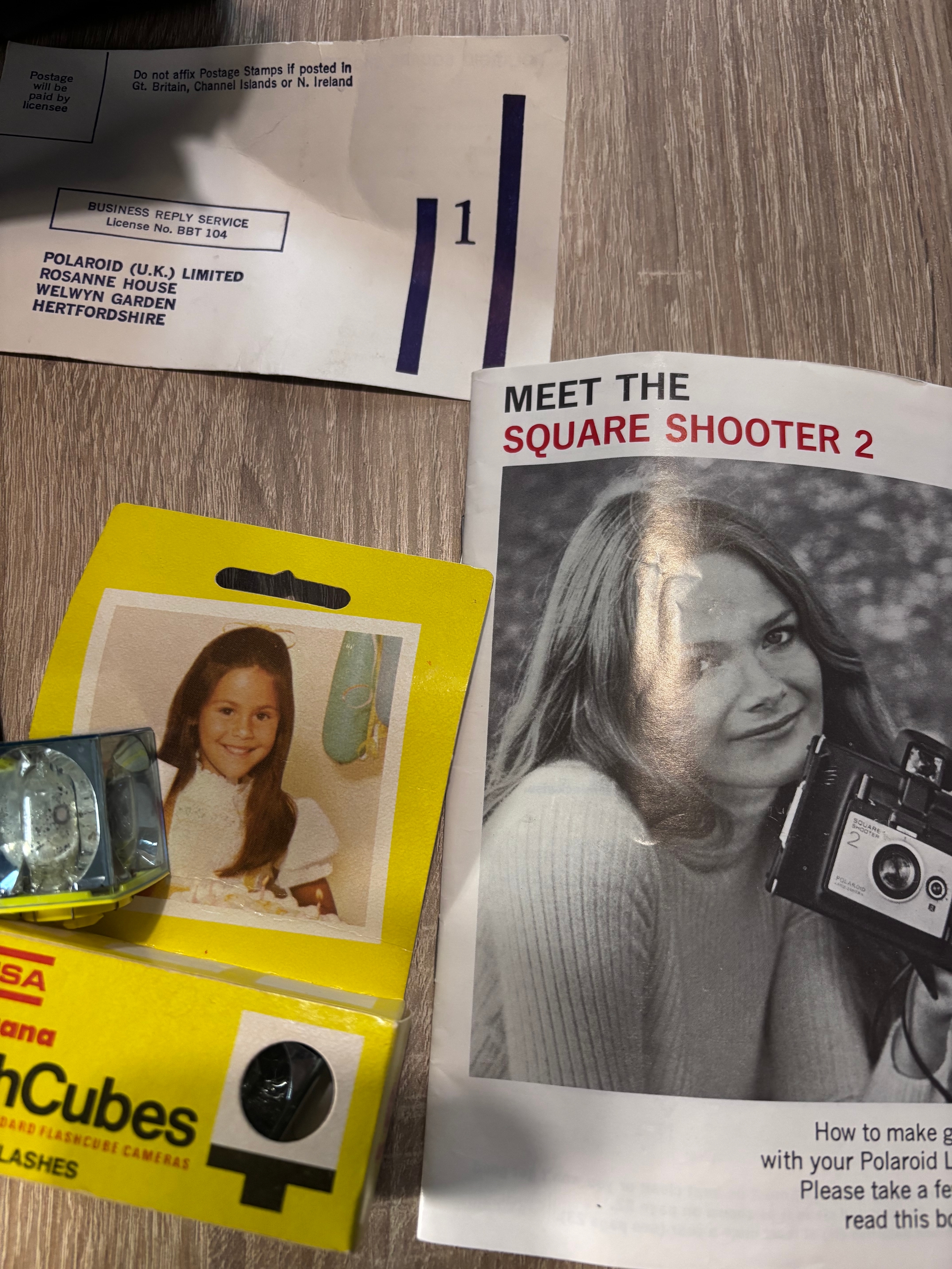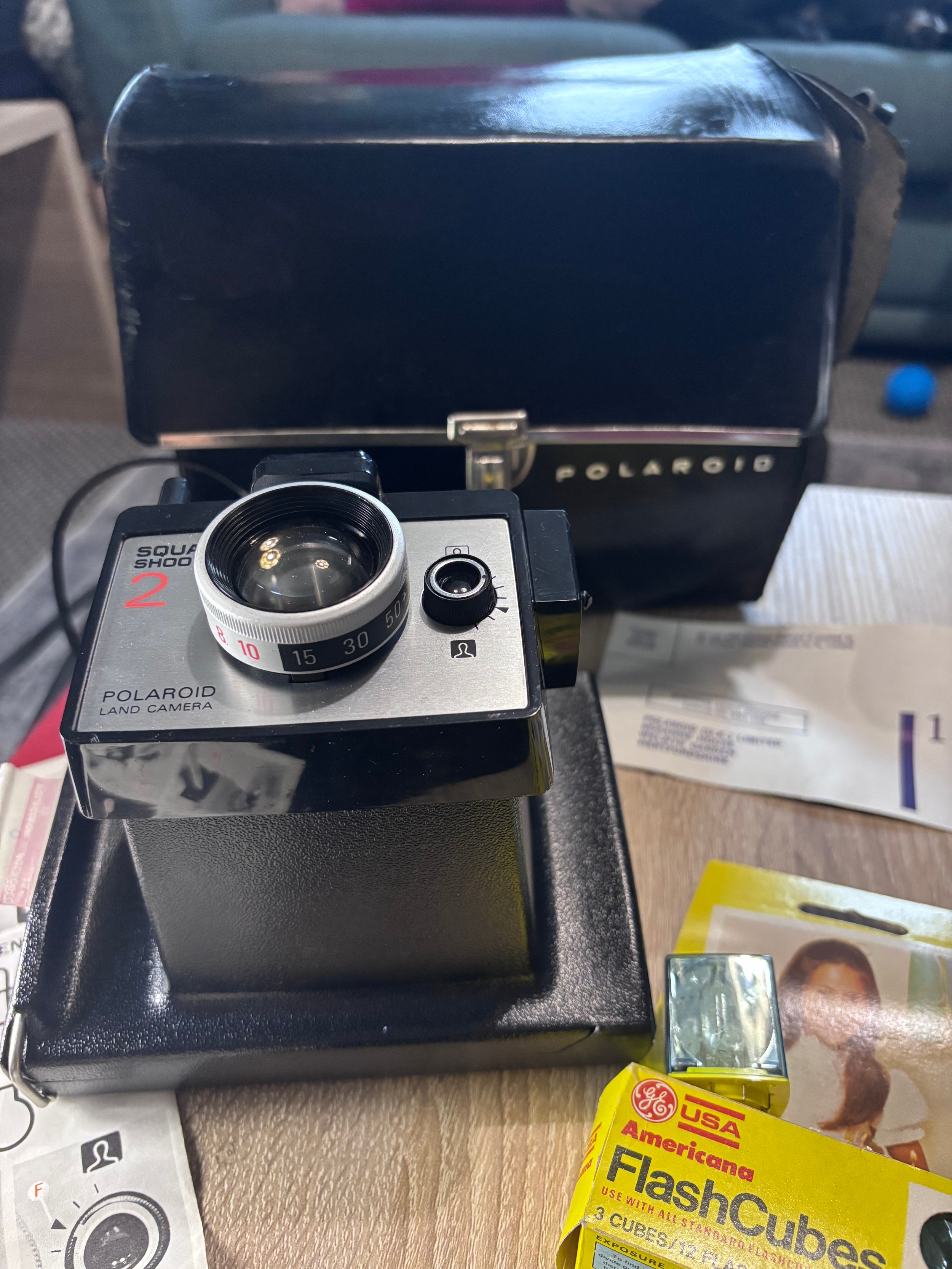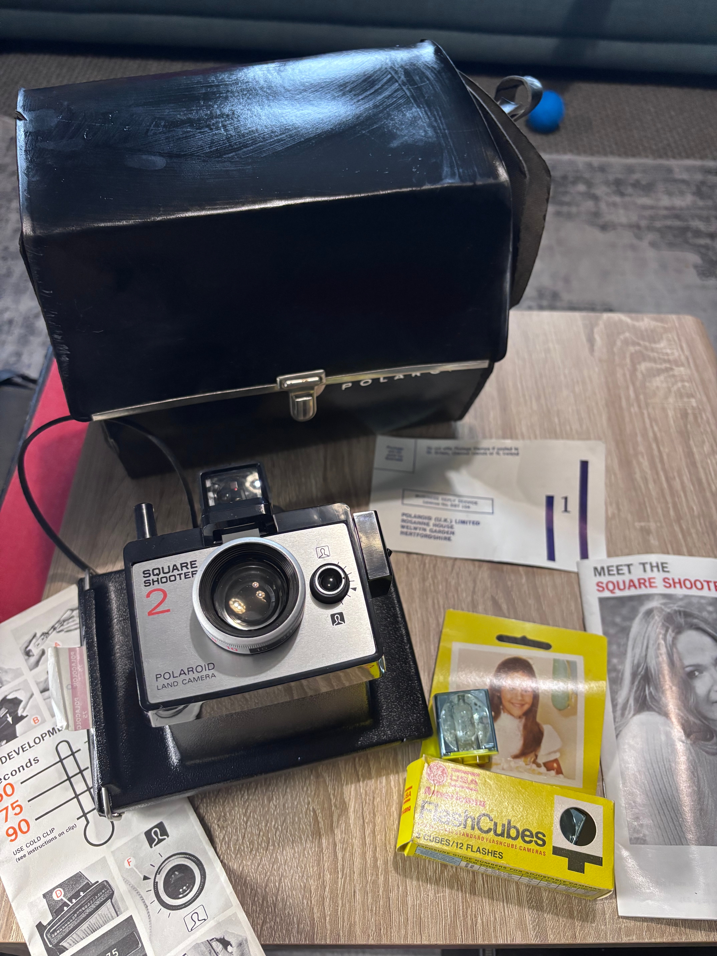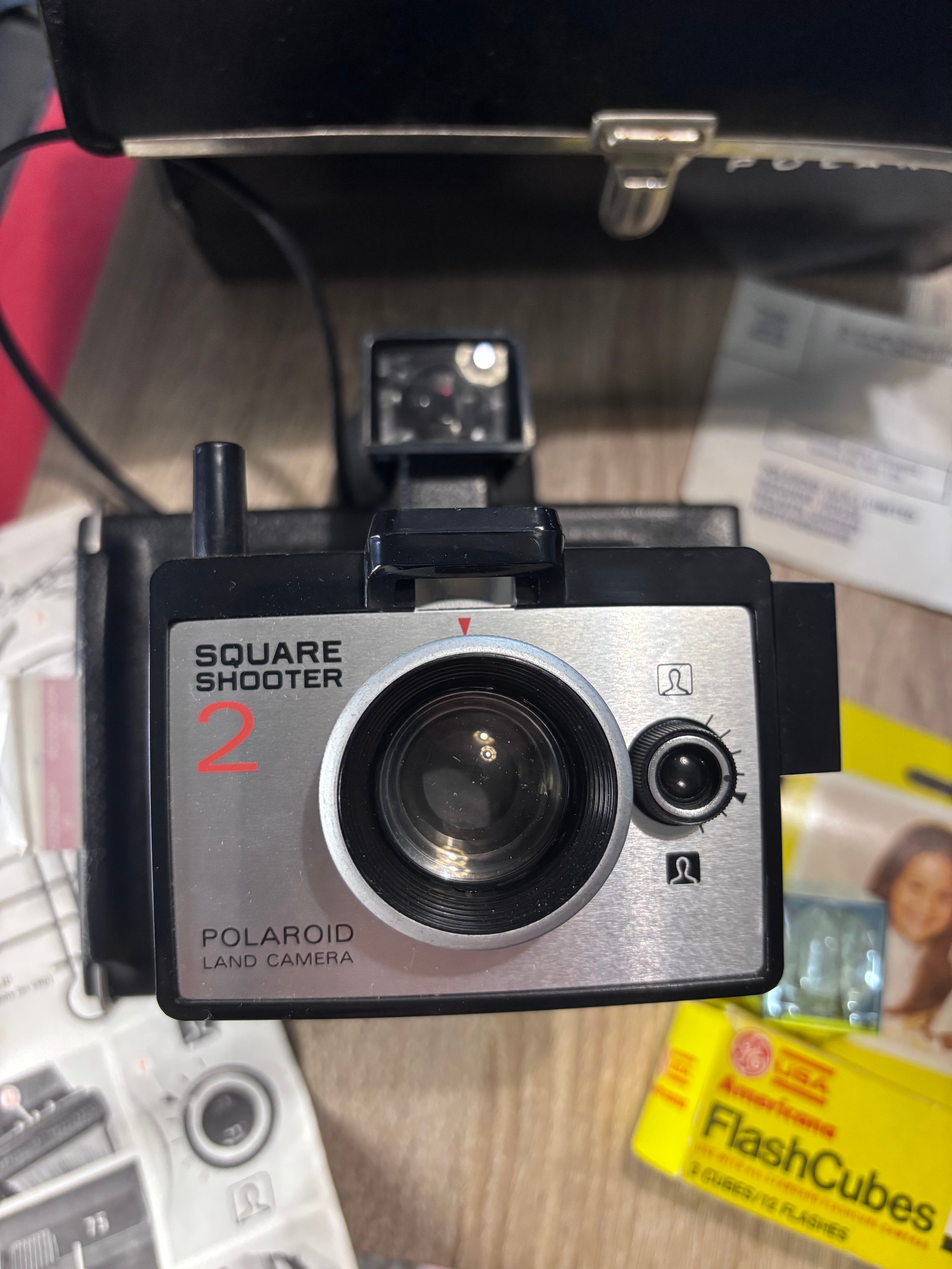 vintage Polaroid Square Shooter 2 Land Camera, a rigid plastic-bodied packfilm instant camera produced in the early 1970s.