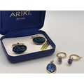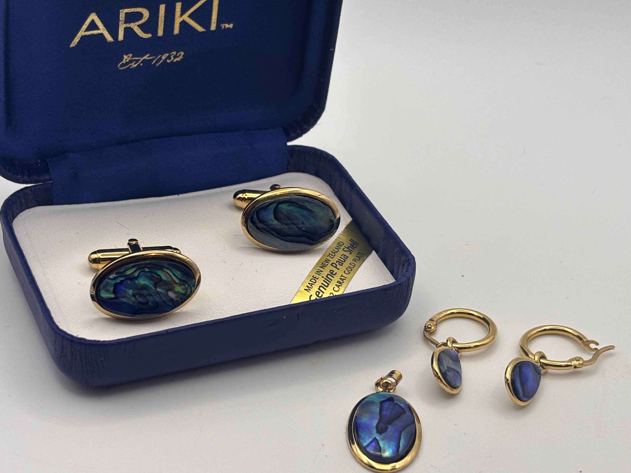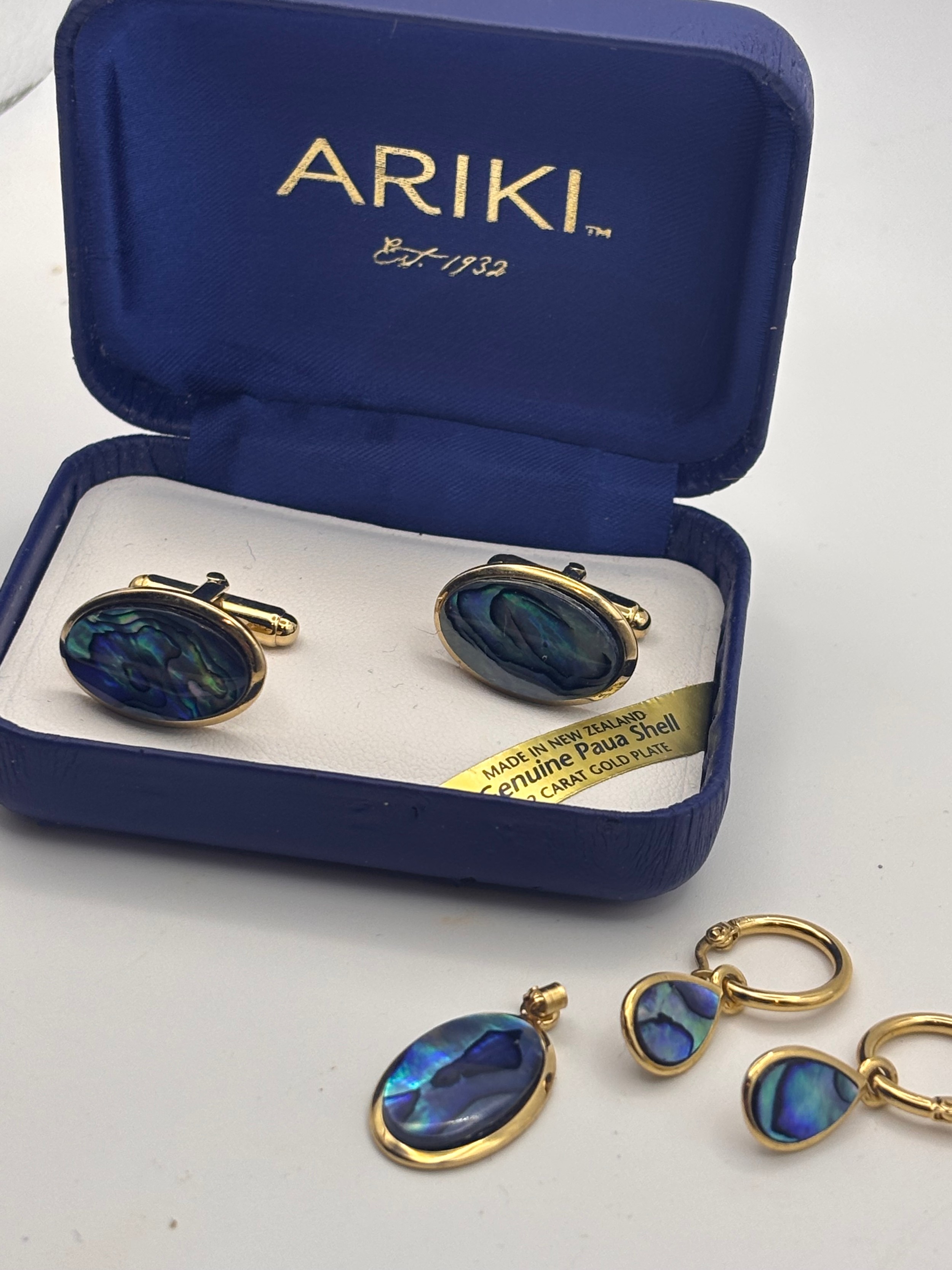 Arike Paua shell collection pendant, earrings and mens cuff links. 22ct gold plated